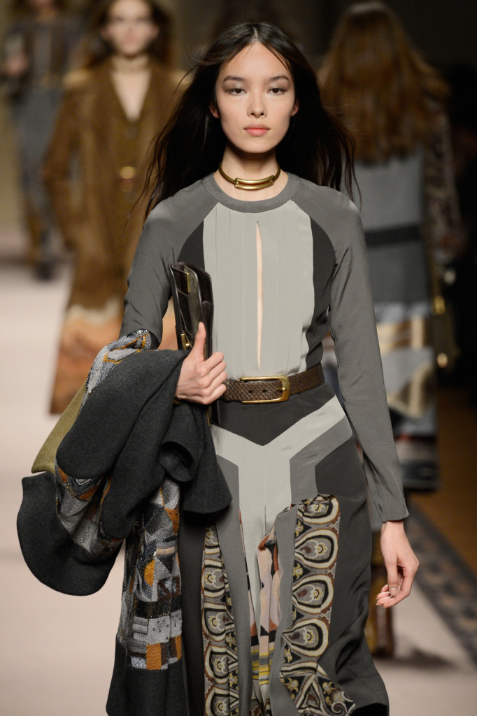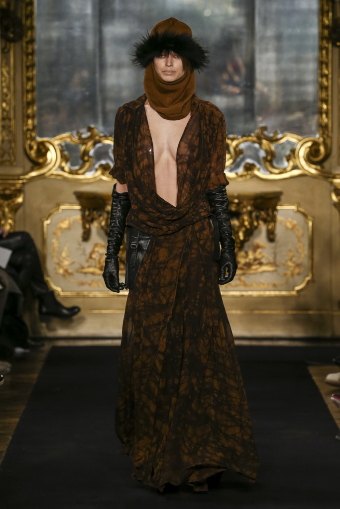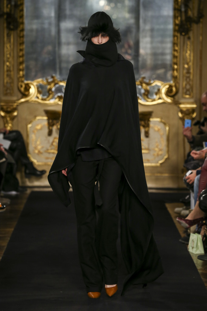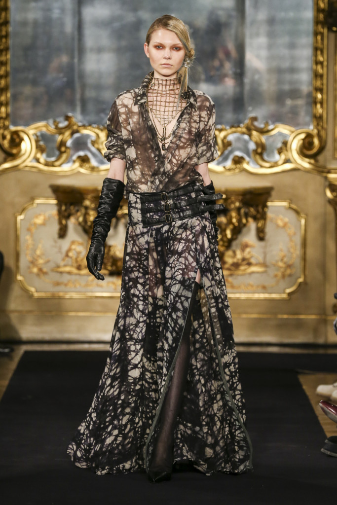 Una collezione “mix & match”. Milano viene investita da un tripudio di jacquard, velluto, seta stampata, motivi ad arazzi, il tutto declinato su abiti lunghi, a pieghe e lineari, pantaloni e cappotti. Tantissimo colore e patchwork. Le note di colore sono sì tipicamente autunnali ma si accendono di luce, di un carattere brillante.