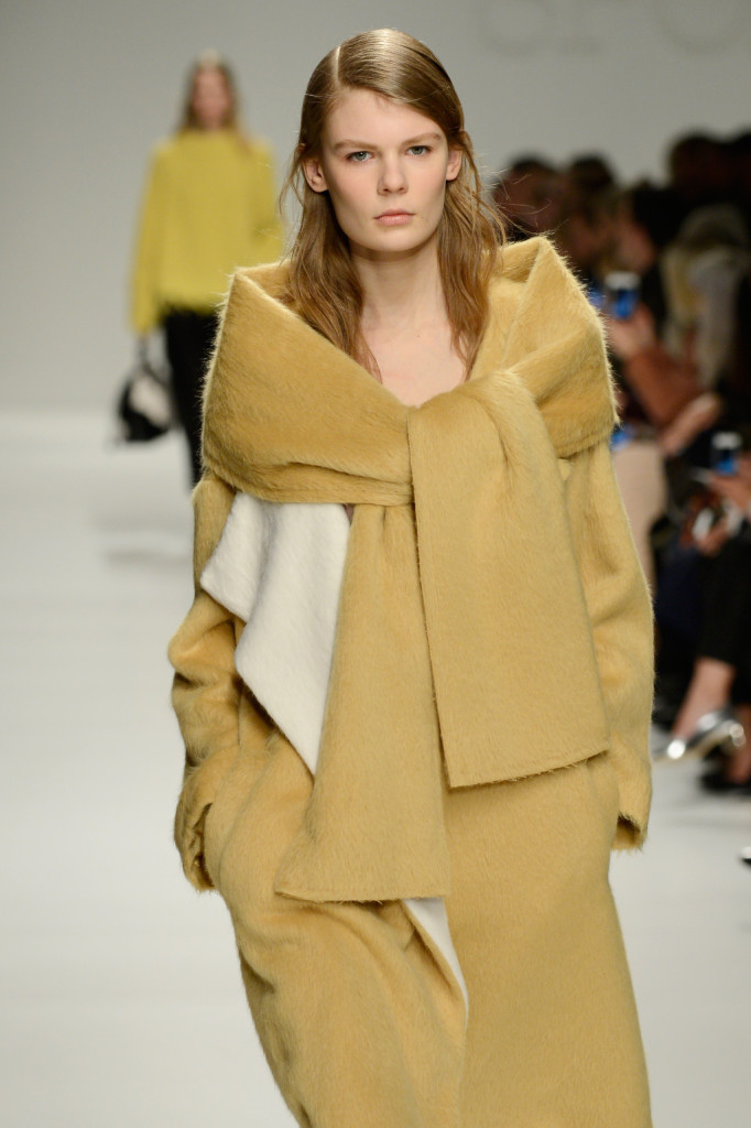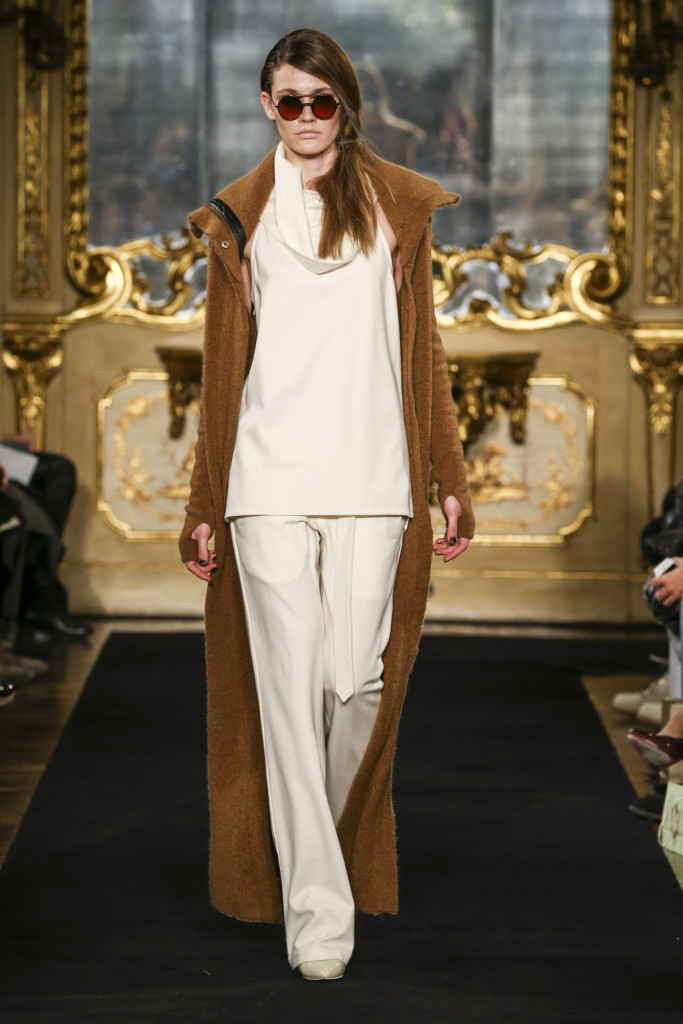 Contro le rigide temperature invernali, Sportmax fornisce la sua personale soluzione: un cappotto oversize a vestaglia, pantaloni ampi e pull di maglia che fungono da abiti. È un abbraccio caldo, morbido, avvolgente. Le coccole vengono da blanket coat in alpaca e bordati di frange; uno knitwear style declinato su skater skirt, giacche e abiti con orli cuciti a mano. Le “rassicuranti coperte” hanno punti vita segnati da cinture in cuoio.
