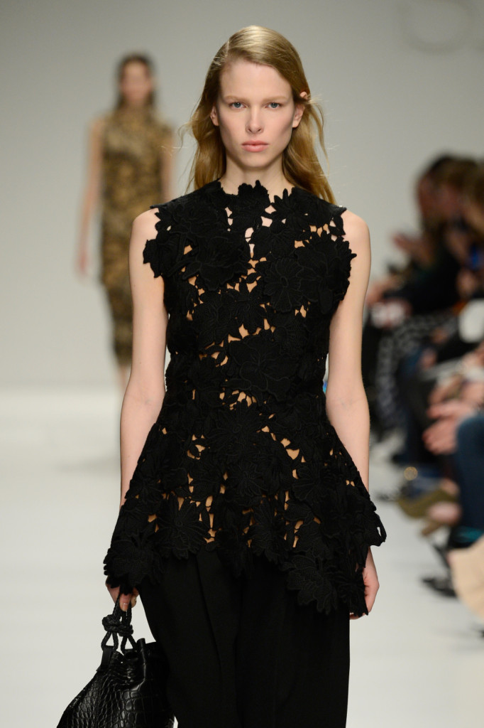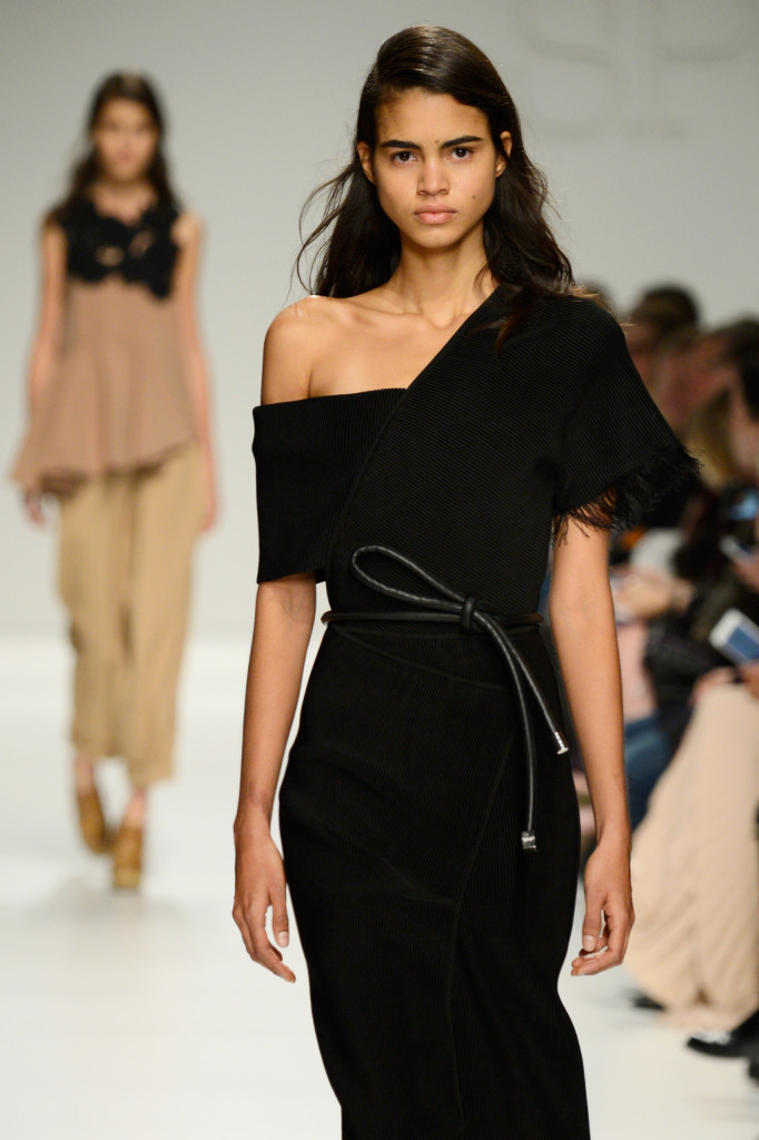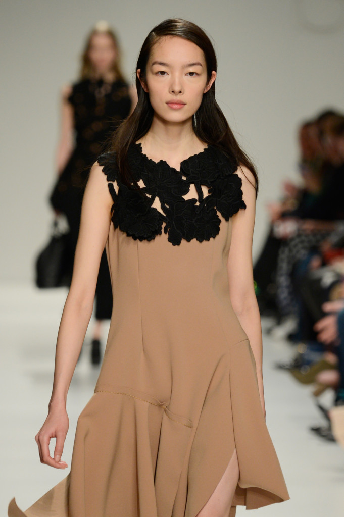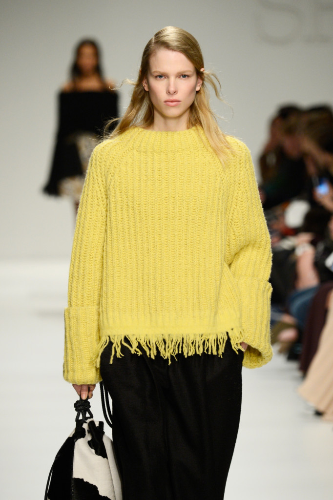 C’è un’interessante alternanza di superfici grezze e trame preziose, di orli frangiati e maxi nodi a ornamento del collo. Le fantasie floreali, come crisantemi e anemoni bordati di nero, si alternano a stampe su maglia, a disegni jacquard su abiti asimmetrici, a insoliti ricami traforati di paglia e seta. Hanno la meglio le tinte cammello, latte, nero, miele, senape, caramello, limone, cipria, ocra.