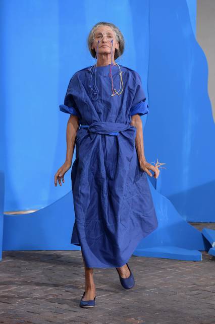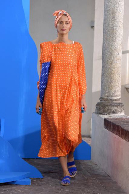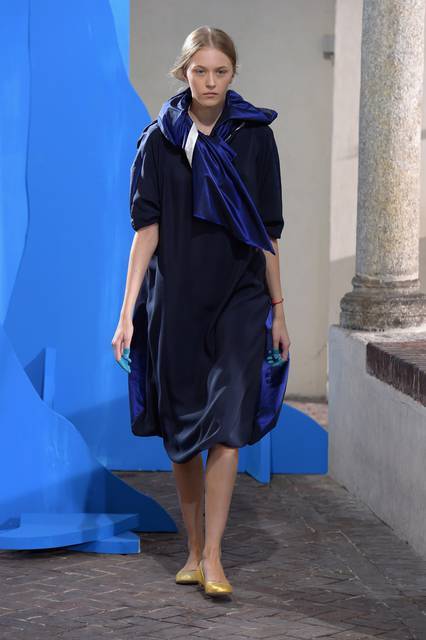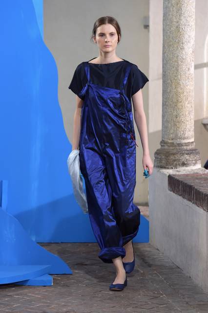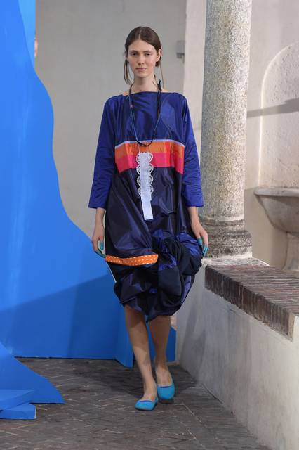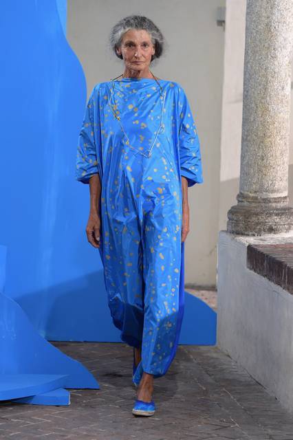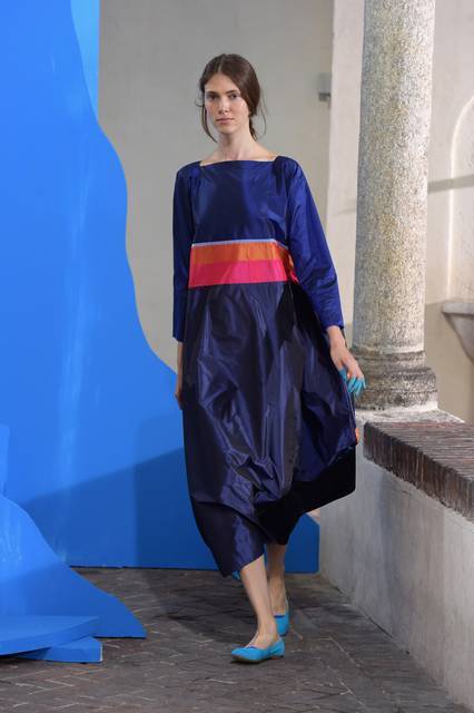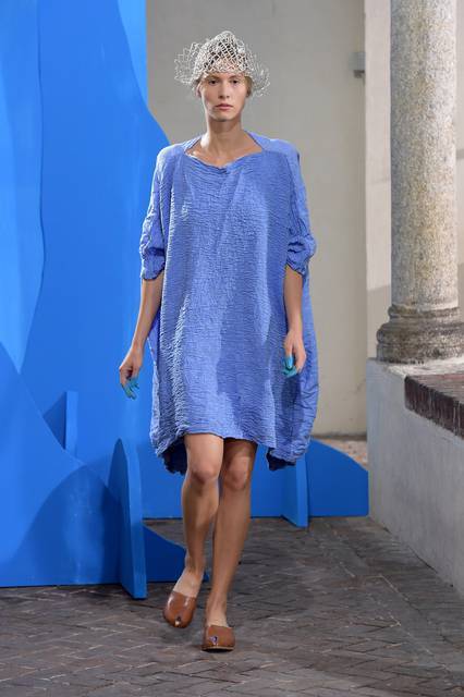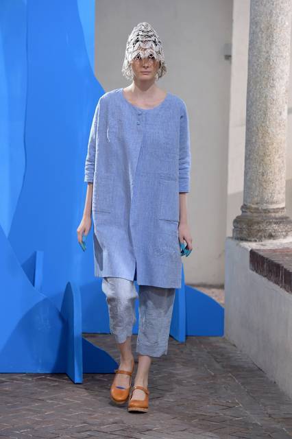 Tuniche lunghe nelle mille sfumature del celeste hanno riempito la passerella milanese, dal celeste del cielo a quello del mar Mediterraneo con uno, quasi impalpabile. Guardando gli abiti di Daniela Gregis avvolge l’istinto di guardare in alto, verso il cielo, proprio come fa la “sua” Celeste che “a volte cerca un posto dove possa volgere il naso all’insù e vedere solo il colore blu”.