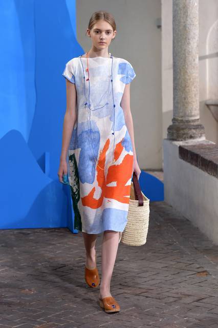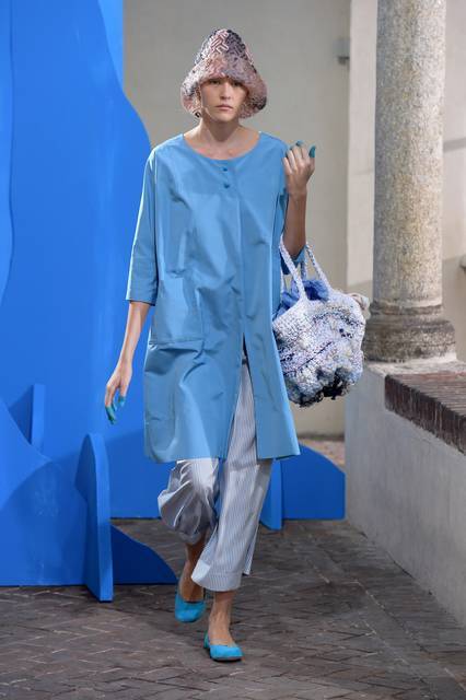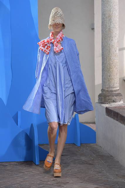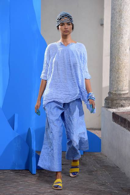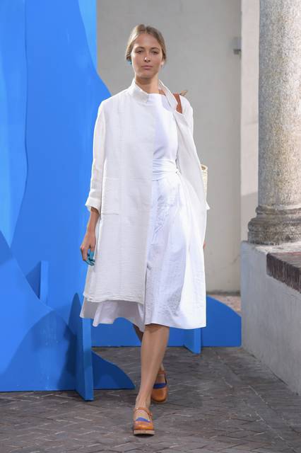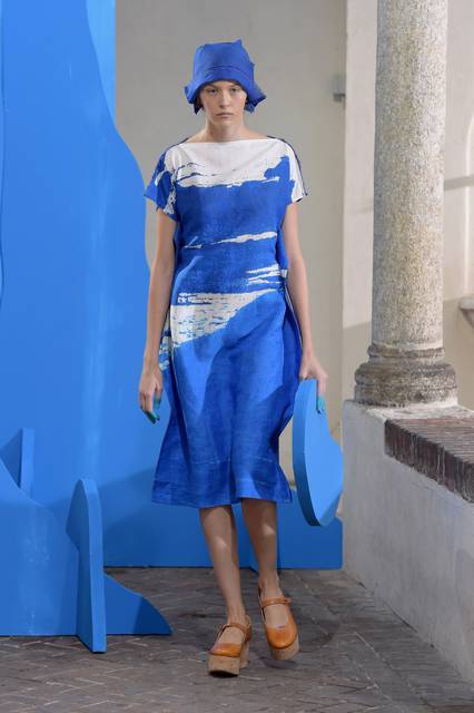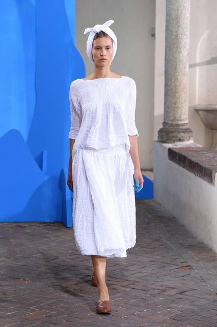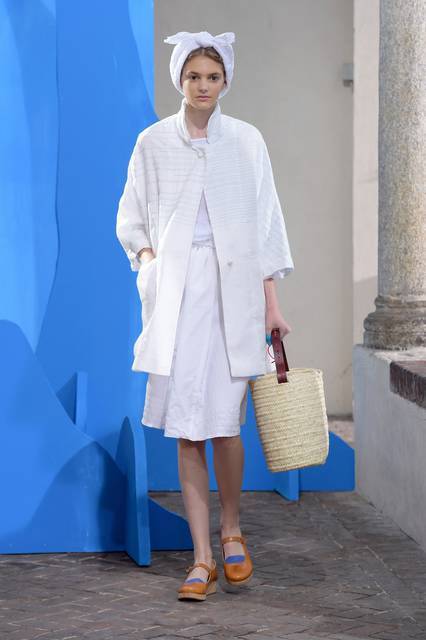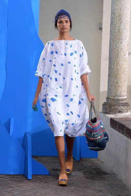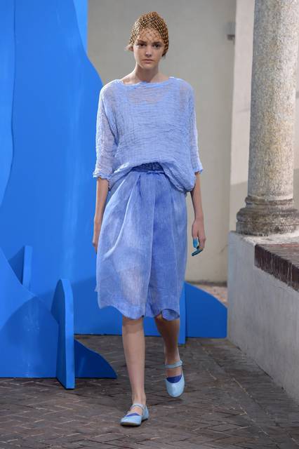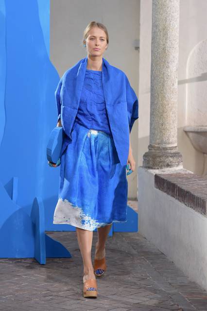 Al blu cobalto si mescola il bianco grezzo del cotone, della canapa, della corda o del legno, nuance naturali e sobrie frutto di quella preziosa ricerca sui tessuti che è un tratto distintivo della stilista.