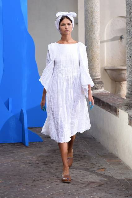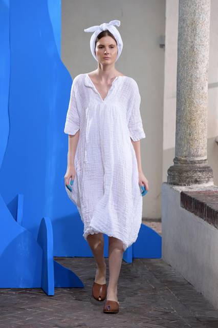 Cuffiette in pizzo e cappellini in corda, turbanti accattivanti e leggere ballerine a coprire i piedi, pantaloni ampi che si gonfiano come le vele di una barca, la donna Daniela Gregis sussurra, non si impone, e raggiunge un effetto, se vogliamo, ancora più forte. Arriva dritta dove vuole arrivare. Leggiadre mannequin evocano l’odore e i sapori dell’infanzia, con gli abiti lunghi e ampi, le nuance delicate, la dolcezza bohemienne che ha conquistato la Milano Fashion Week.