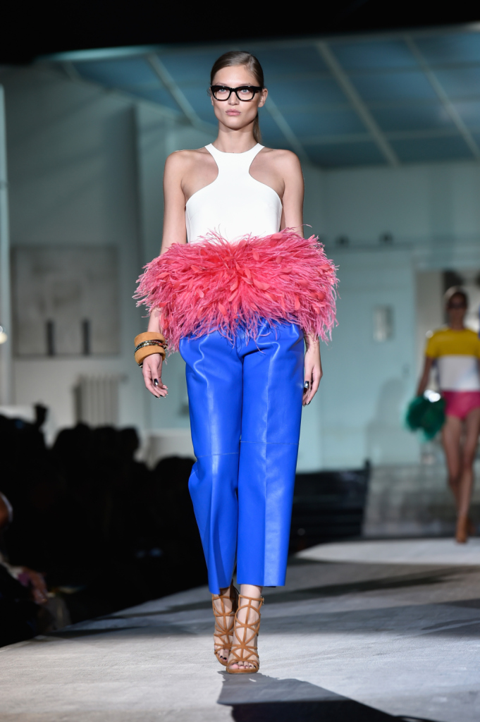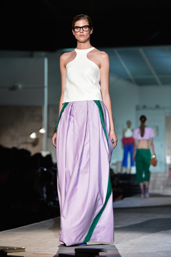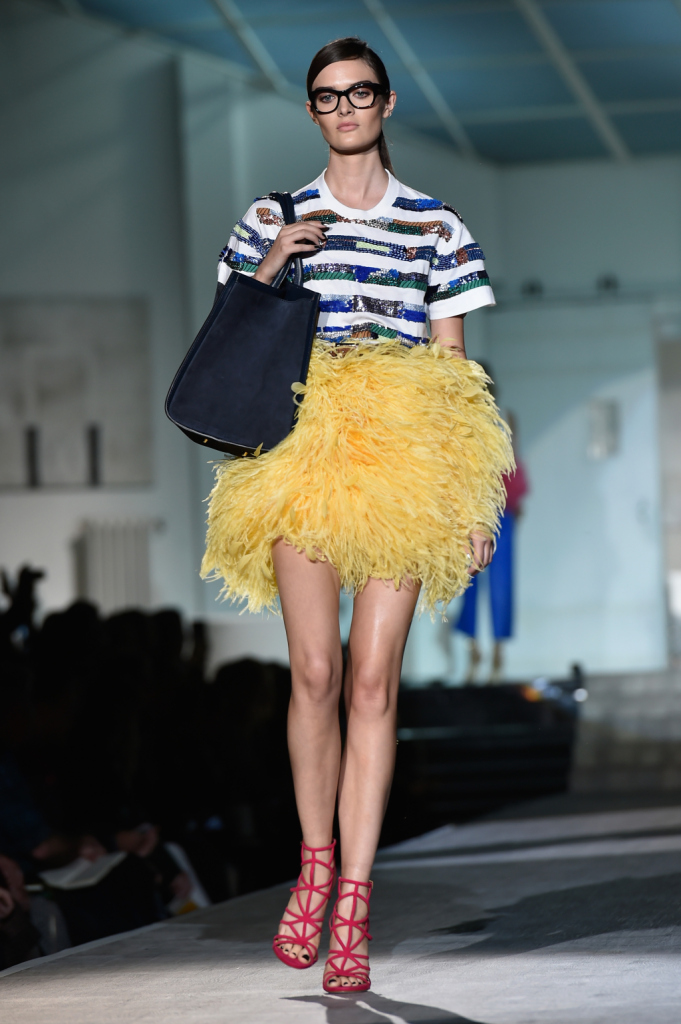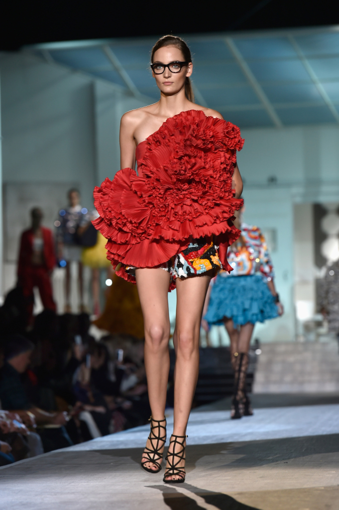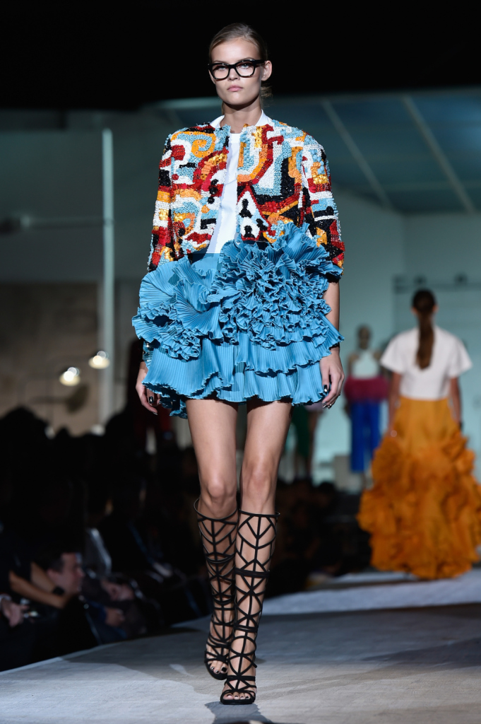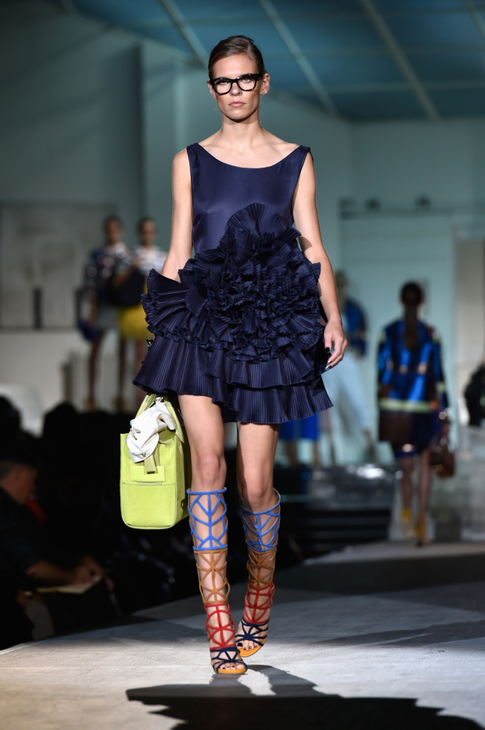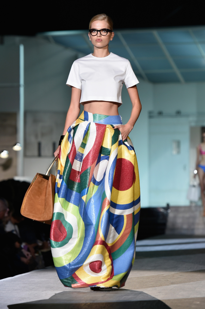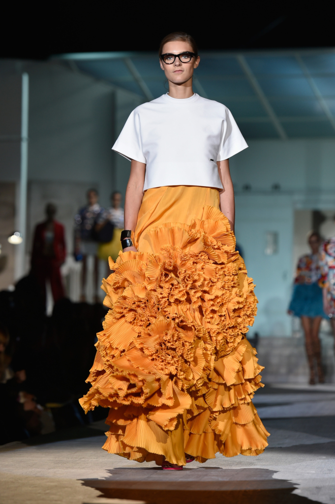 Dove la passerella diventa una festa chiassosa e ispirata. Ad aprirla, outfit pittoreschi e fiabeschi – in alcuni casi, perfino da fumetto –, con ampie gonne rigide, tessuti con maxi stampe a tutta lucidità che richiamano la pittura astratta e pure l’arte pre-colombiana, vere e proprie sculture tutte balze e ruches. Giallo, arancione, rosso e rosa, azzurro e blu risaltano in tutta la loro grinta sul bianco come fuochi artificiali.
