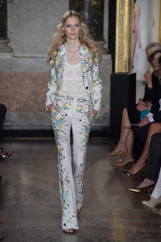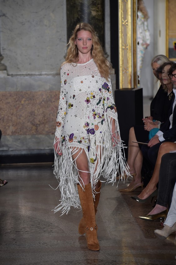 Ma oltre ai maxi dress decisamente voluminosi che ricordano gli abiti foulard tipicamente estivi, non mancano anche quelli più corti dalla silhouette molto aderente; infatti a dare il via alla sfilata è stato proprio un mini dress ricamato in macramé, con applicazioni di fiori del tutto ricamati, con l’aggiunta di dettagli luccicanti.