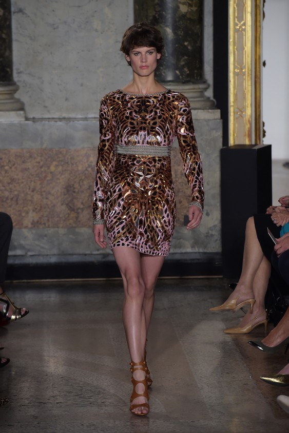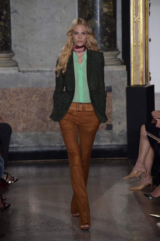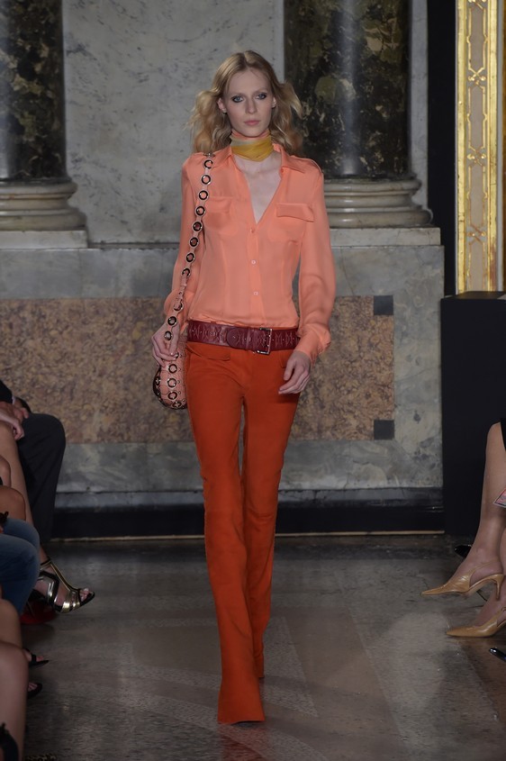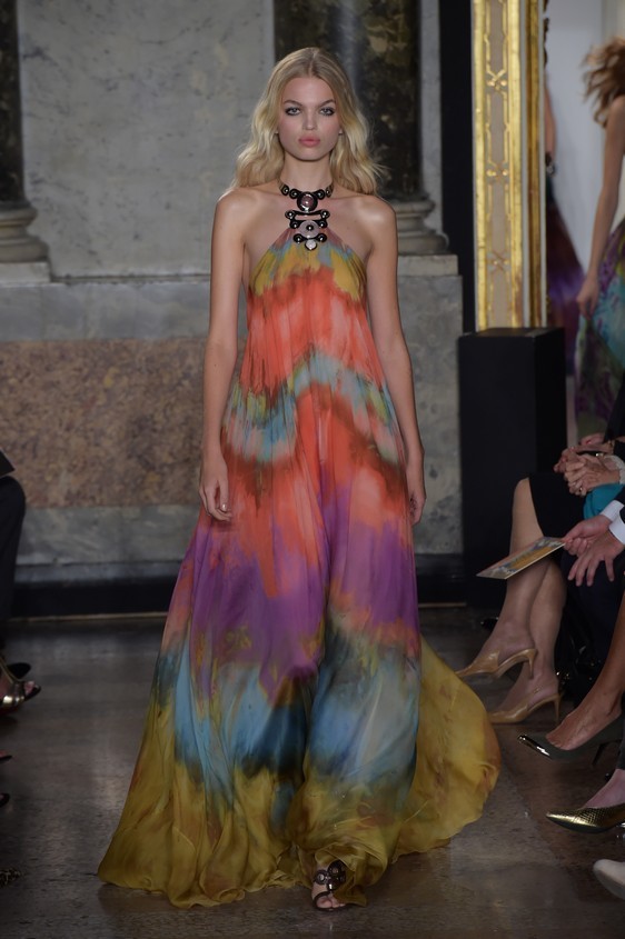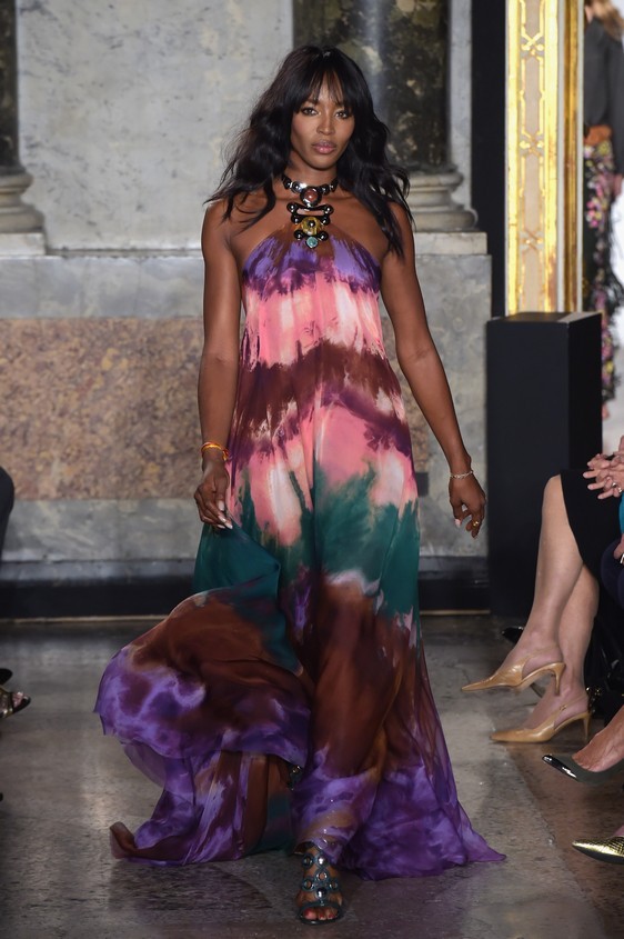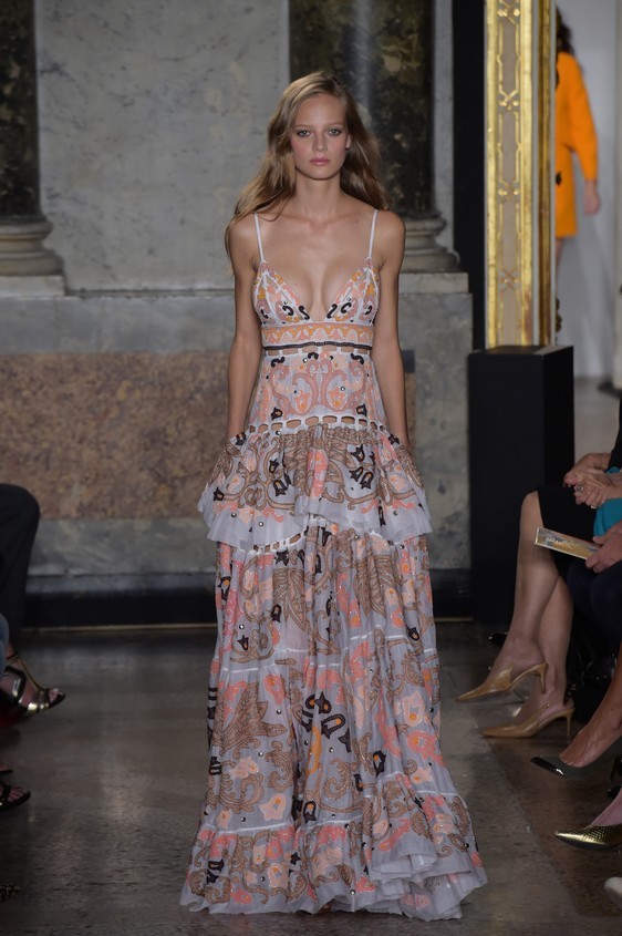 Il fashion designer per la collezione primavera-estate 2015, resta perfettamente in linea con il classico mood firmato Pucci. I long dress, un po’ over dal tessuto leggero con balze e ruches, infatti vengono creati con le fantasie colorate, ormai inimitabili di Emilio Pucci, perfetti per essere indossati ai party estivi. Questi abiti che hanno attirato particolarmente l’attenzione sulla passerella milanese, oltre per la loro bellezza, ma grazie anche ad una modella d’eccezione: Naomi Campbell.