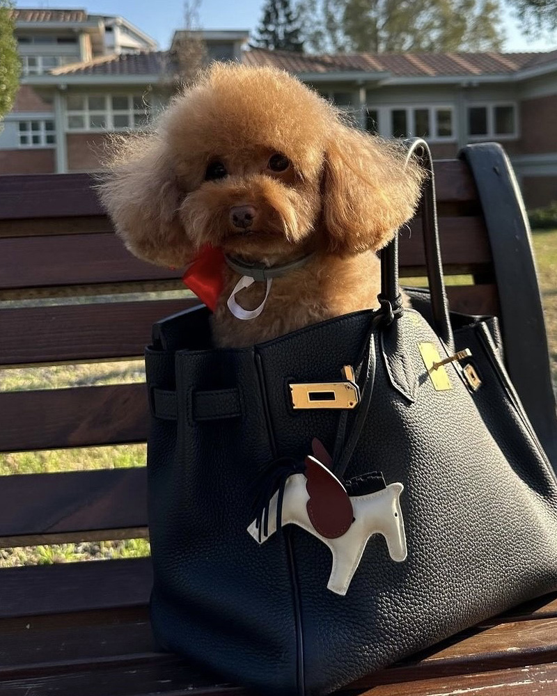Il trend di sistemare il proprio animale domestico nella Birkin di Hermès ha attraversato l’oceano, sbarcando a Roma. Dopo aver portato il suo barboncino, Twenty Zaccagni, ad accorciare il pelo, Chiara Nasti ha trascorso qualche minuto su una panchina. Lì ha appoggiato la sua Birkin in pelle nera: e chi c’era dentro? Il cagnolino, ovvio! Il cucciolo, fresco di toilettatura, posa sereno. E’ a tema animali anche il charm che pende dalla it-bag: ai fashionisti non sfugge infatti il portachiavi di Pegaso, il cavallo alato mascotte della maison francese. Dopo cani e biberon, cosa vedremo nelle Birkin delle star?