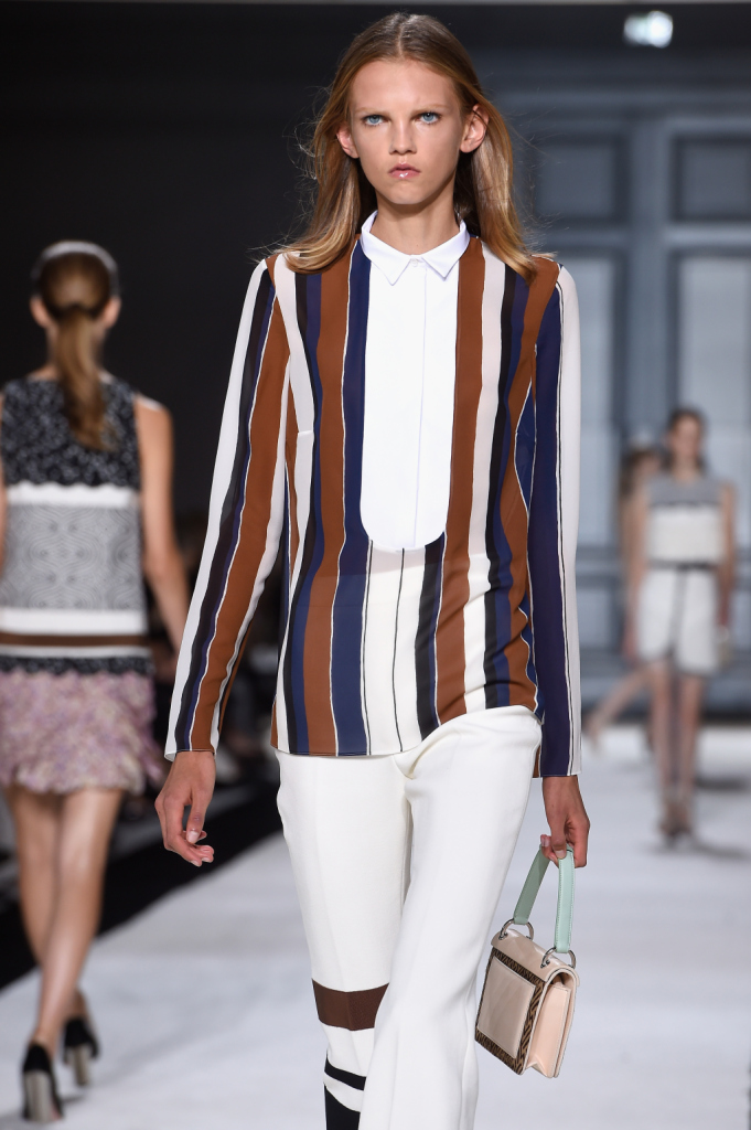 A differenza di molti altri suoi colleghi, per la primavera-estate 2015 Giambattista Valli opta per una silhouette sottile. Esaltata dalla pulizia delle linee, nette e affusolate, e dal contrasto studiato dei materiali, dalle stampe, dai broccati, dalle appliques che caratterizzano i pantaloni palazzo abbinati per lo più a bluse, gli abiti lunghi e di uno chic essenziale, i mini dress e i completi top+gonna con pannelli da falso peplo.