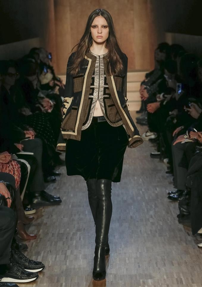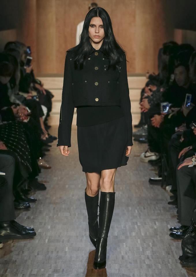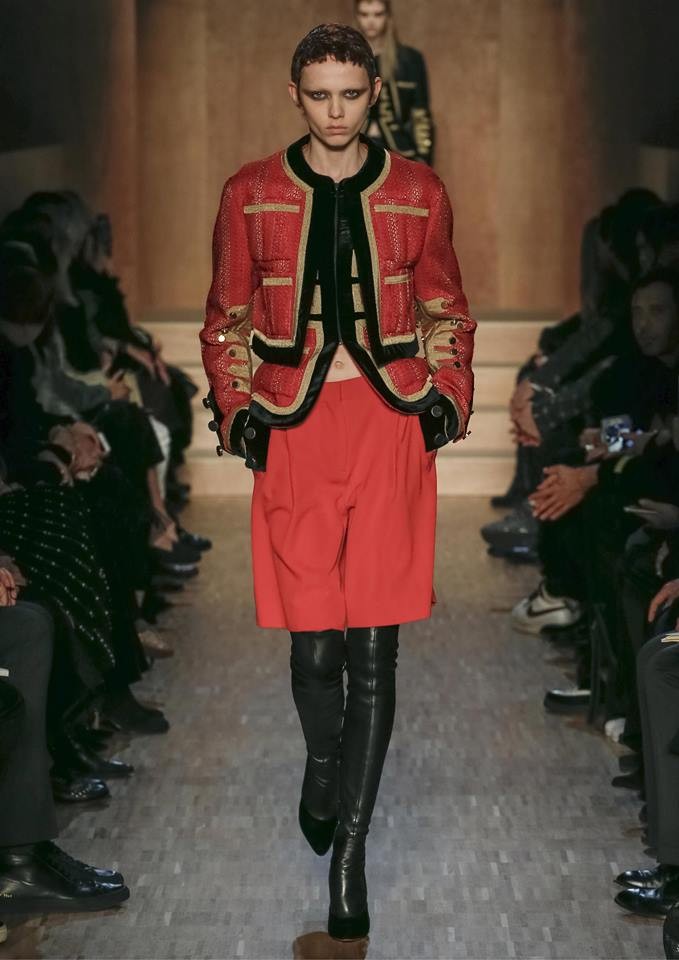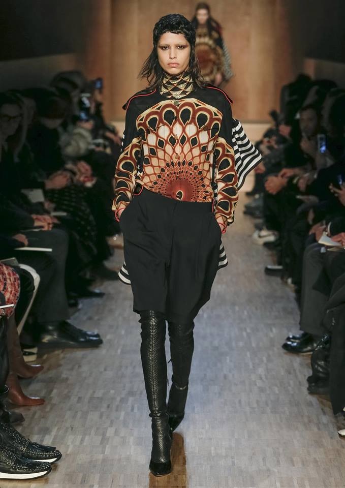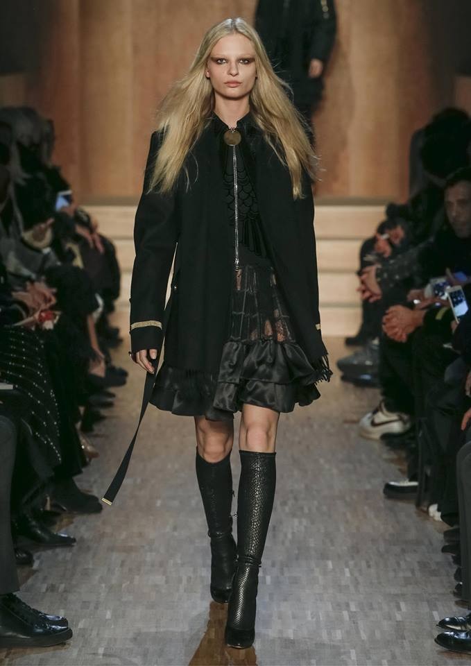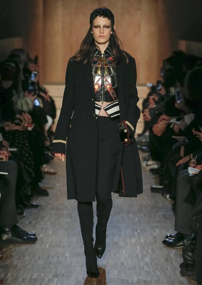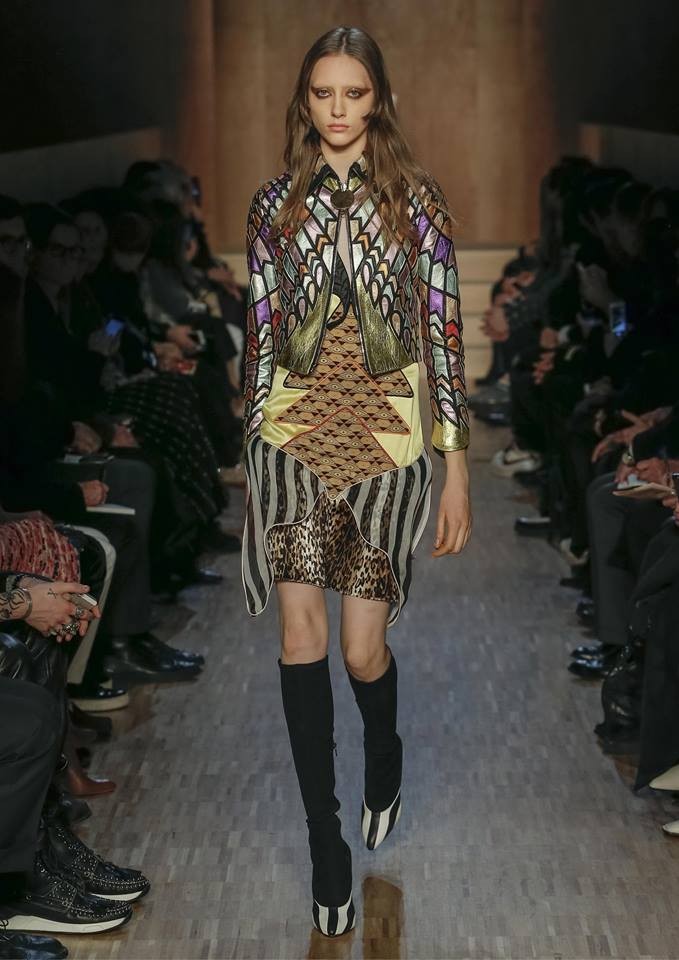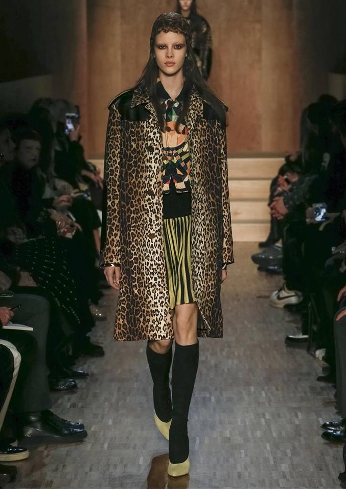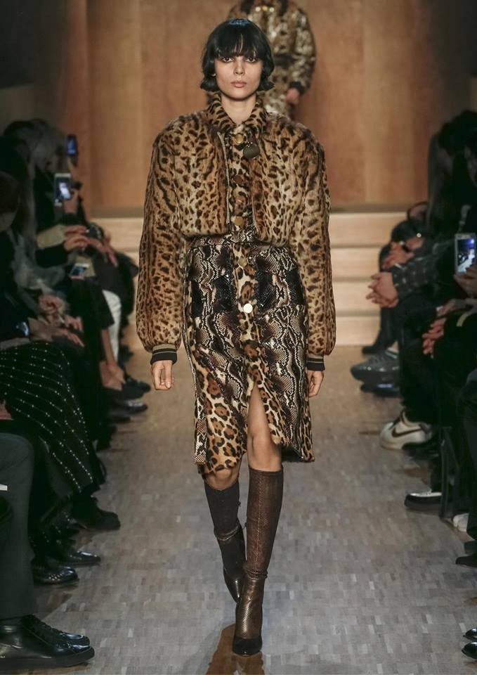 L’elemento “animale” è fortemente presente nella proposta per la prossima stagione di Givenchy, con Tisci che lo utilizza anche nell’accezione più classica (ed eighties) della fantasia leopardata per trench, coat e bomber dallo stile casual chic e in quella decisamente meno convenzionale e diffusa delle piume di pavone per vestiti e bluse eccentricamente eleganti. Un  vero e proprio “bestiario”, in cui c’è spazio anche per la pelle di pitone per gli stivali, di fatto uno degli elementi principali della collezione autunno-inverno 2016-2017 della maison.