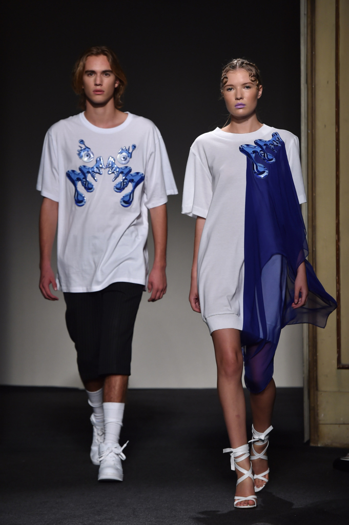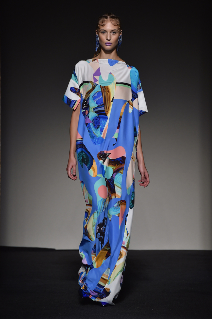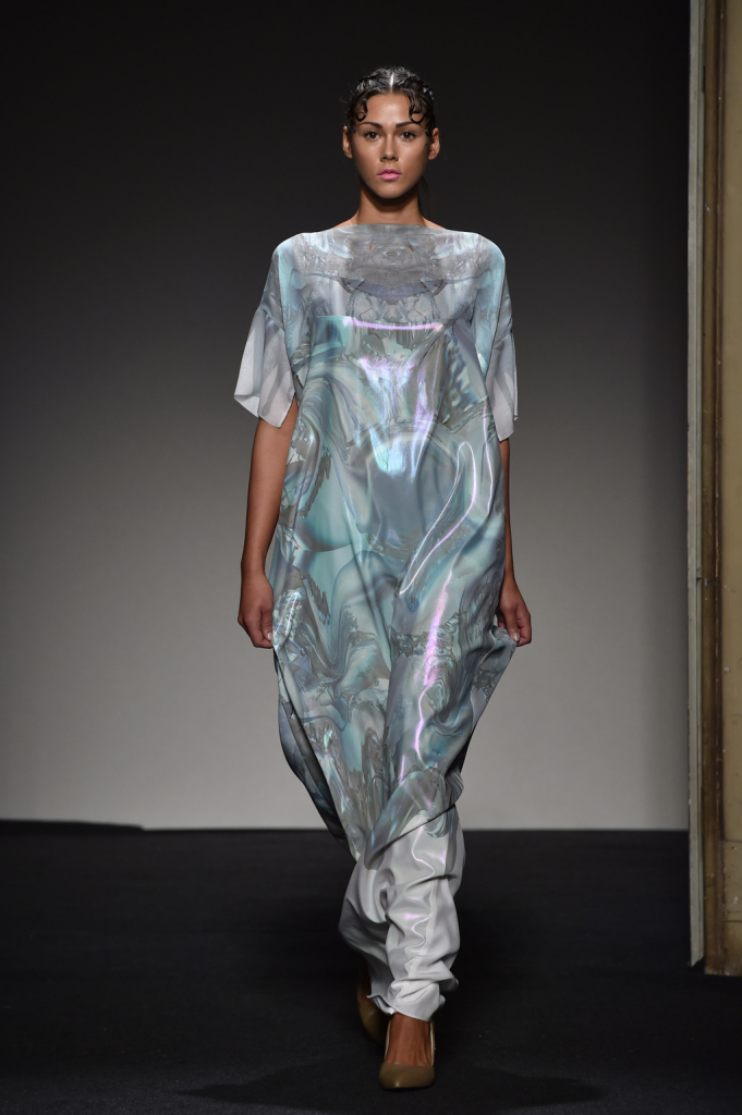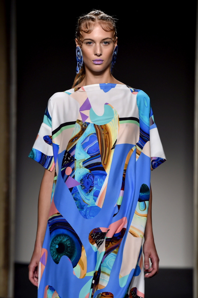 Grinko prende l’abbigliamento “easy”, declinato anche nell’ossessione denim fresca di revival, e lo trasfigura in geometrie semplici, creando silhouette che accompagnano il corpo e donano leggerezza, anche quando si compongono di tessuti e stampe molto presenti e molto moderni. È una moda che non si accontenta di essere alla moda e dall’attualità vuol trarre insegnamenti più duraturi dei trend momentanei. È così che le stampe d’impronta digitale finiscono per assomigliare a dei Kandinsky, come tutta la tavolozza di colori della collezione, e il total denim diventa una sottile trasparenza azzurra, leggera come l’aria. Il motivo dell’occhio, che guarda ma allo stesso tempo piange, è un’ossessione che ritorna in tutte le dimensioni, dalla grande macchia azzurra al piccolissimo motivo geometrico e, in quanto “vista” e “sguardo”. rimanda alla presa di coscienza della realtà che ci circonda, una presa di coscienza che non può essere rimandata o rimossa. È qui che nasce il Sinthetic Riot, la ribellione dell’attuale che vuole trascendere l’attimo, celebrando i grandi trend ma allo stesso tempo trasformandoli completamente, per affermare il proprio punto di vista, il proprio -appunto- sguardo.