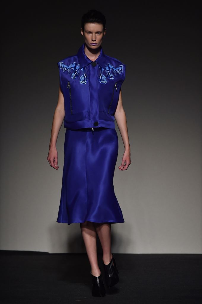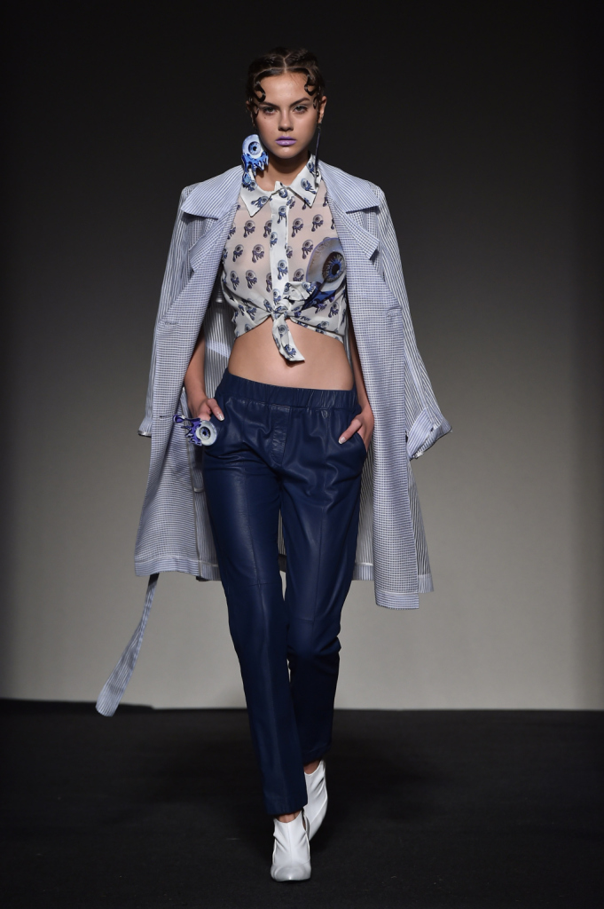Pantaloni tecnici, top impalpabile e soprabito tra toni del blu e decorazioni simobolo / Grinko SS 2015