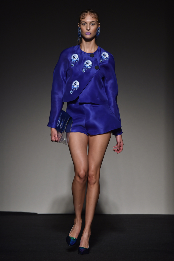 Dettagli occhio su borsa, orecchini e giacca per questo total blue / Grinko SS 2015