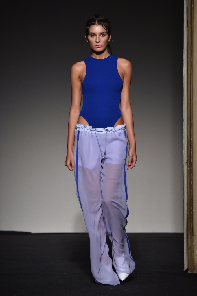 Body nel blu iconico della collezione abbinato con pantaloni di ispirazione sportiva / Grinko SS 2015