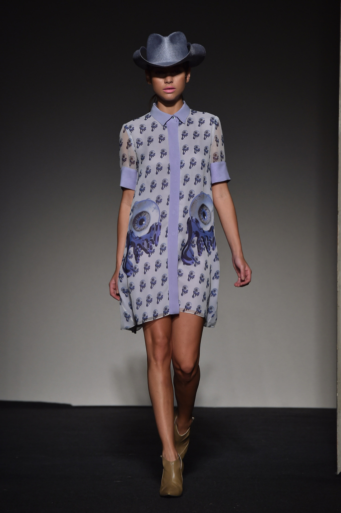 Contrasti tra la leggerezza dell’abito, i motivi occhio e il copricapo in stile texano – Grinko SS 2015