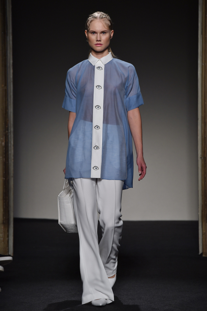 Il tema dell’occhio torna anche qui, nella chiusura della casacca azzurra / Grinko SS 2015