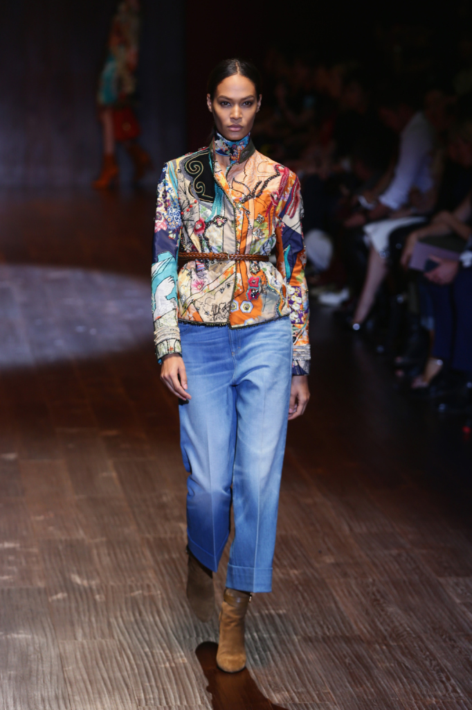 Gucci, MFW, collezione Primavera-Estate 2015: denim a palazzo con blusa fantasia e giacca verde in stile militare