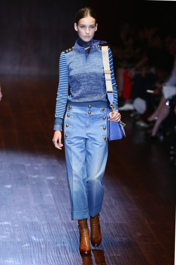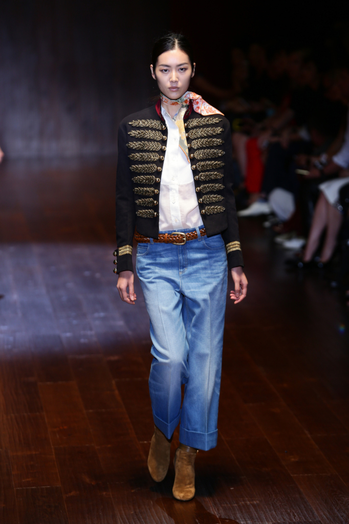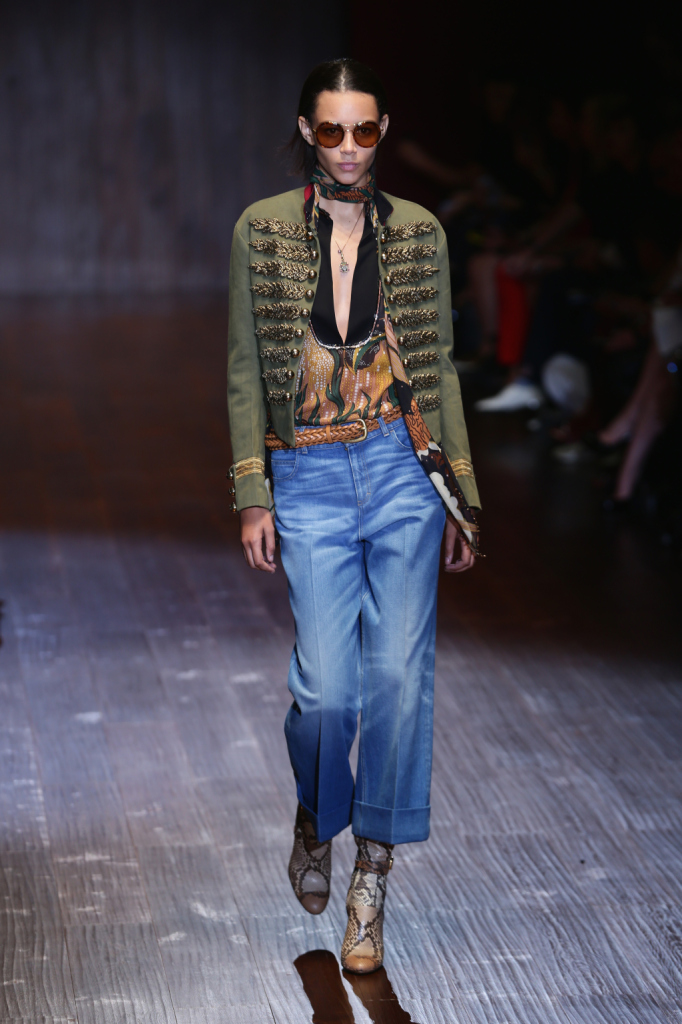 Gucci, MFW, collezione Primavera-Estate 2015: denim boyfriend oversize alla caviglia, giacca con dettagli militari dorati e foulard