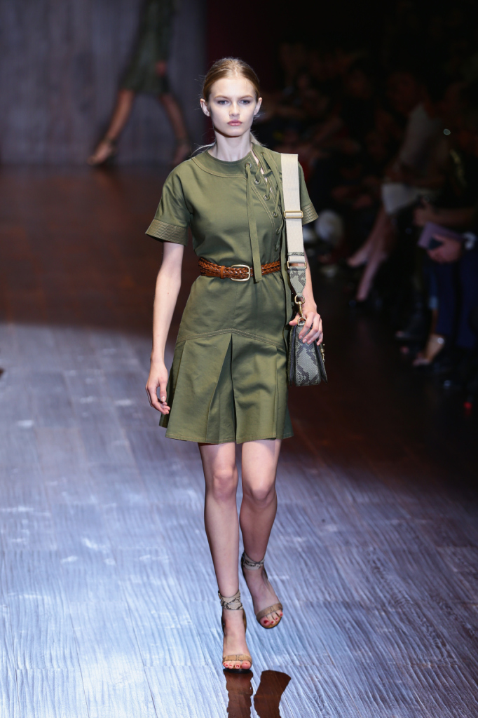 Gucci, MFW, collezione Primavera-Estate 2015: miniabito color verde militare con particolare allacciatura alla francese sulla spalla e strizzato da cintura intrecciata di cuoio in vita