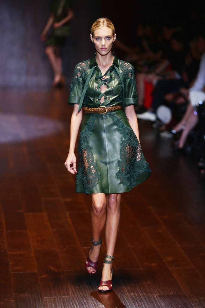 Gucci, MFW, collezione Primavera-Estate 2015: miniabito in pelle color verde muschio con intarsi effetto pizzo e rete, allacciatura alla francese sul petto e cintura di cuoio in vita