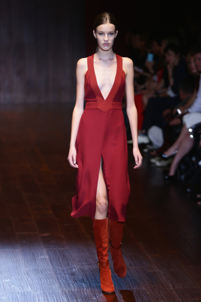 Gucci, MFW, collezione Primavera-Estate 2015: abito lungo in seta rosso marsala, avvolgente, con ampio scollo a V sul davanti e ampio spacco. Gli stivali in camoscio sono color rosso ruggine