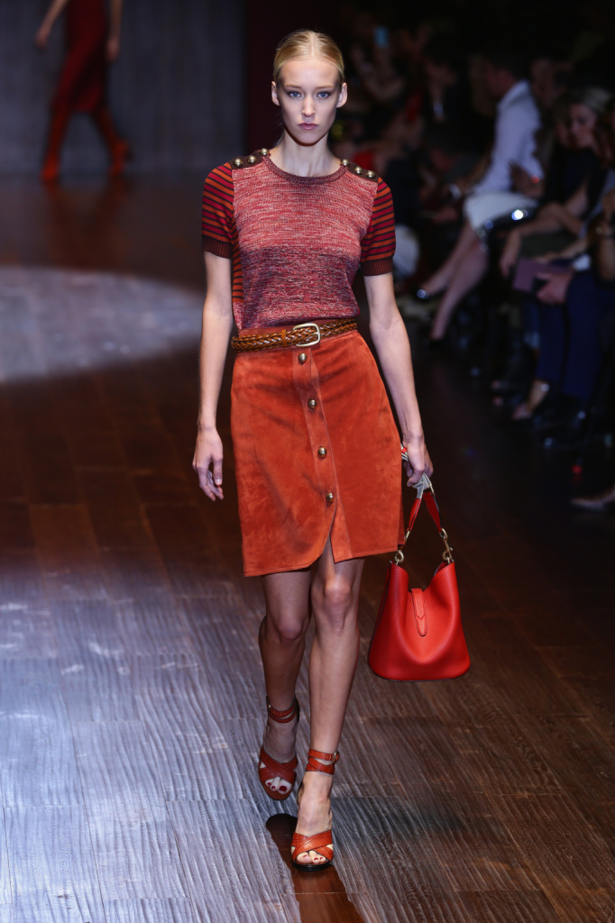 Gucci, MFW, collezione Primavera-Estate 2015: gonna al ginocchio in camoscio ruggine con motivo bottoncini dorati sul davanti ripresi anche sulle spalle della maglietta a righe nei toni del rosso