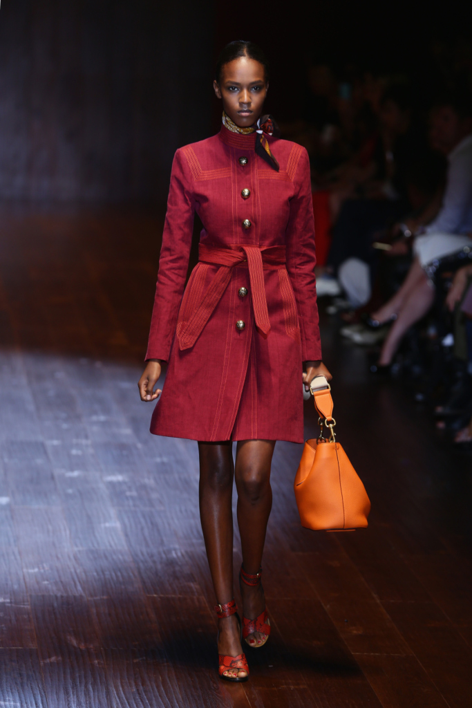Gucci, MFW, collezione Primavera-Estate 2015: trench rosso marsala in stile militare con motivo bottoncini dorati, abbinato a borsa arancio con tracollina e sandali in pitone