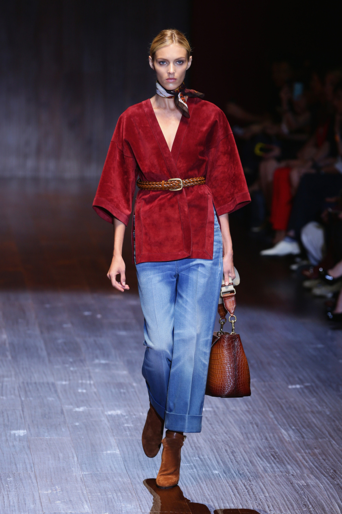 Gucci, MFW, collezione Primavera-Estate 2015: la maglia stile kimono rosso marsala è in camoscio ed è abbinata a un jeans baggy boyfriend, ad altezza caviglia portato largo e con risvolto