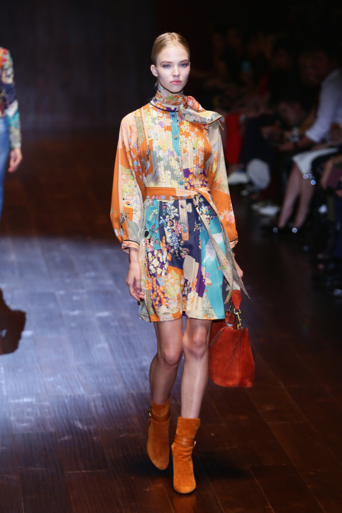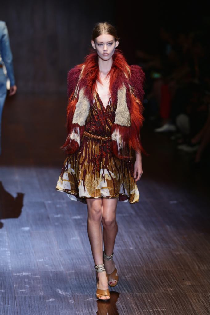 La donna Gucci per la PE 2015 veste un look che accenna agli anni Settanta con estrema versatilità, toccando più stili e fondendoli insieme per un risultato davvero ben bilanciato. Uno dei capisaldi della collezione è il mood di provenienza hippie, con jeans dal taglio boyfriend o pantaloni a palazzo in camoscio che si abbinano perfettamente a bluse di pizzo allacciate con nastri alla francese e occhielli metallici, o a giacche in stile militare decorate da una serie di bottoni dorati posti anche su delicate magliette in stile marinaresco. Il camoscio è forse uno dei materiali più evidenti sulla catwalk, con trench nelle tonalità ruggine e arancio impreziositi da bottoni dorati e cappotti verde muschio legati in cintura con reminiscenze quasi rinascimentali. L’atmosfera infine si fa più calda e raffinata con gli abiti da cocktail in seta stampata, leggeri e fluidi, a volte abbinati a coprispalle e giacche voluminose di pelliccia, oppure lavorati nella parte anteriore con dettagli militari in broccato, o con taglio a kimono che sembra riportare in auge tutta la sensualità della geisha e dell’Oriente. Il tutto reso ancora più glam se illuminato da un qualche lustrinotone sur tone.