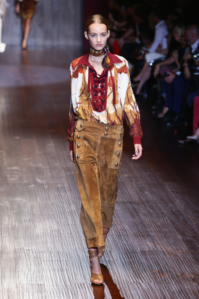 Gucci, MFW, collezione Primavera-Estate 2015: pantaloni in camoscio marroni con bottoncini dorati in stile marinaresco e blusa fantasia con allacciatura alla francese
