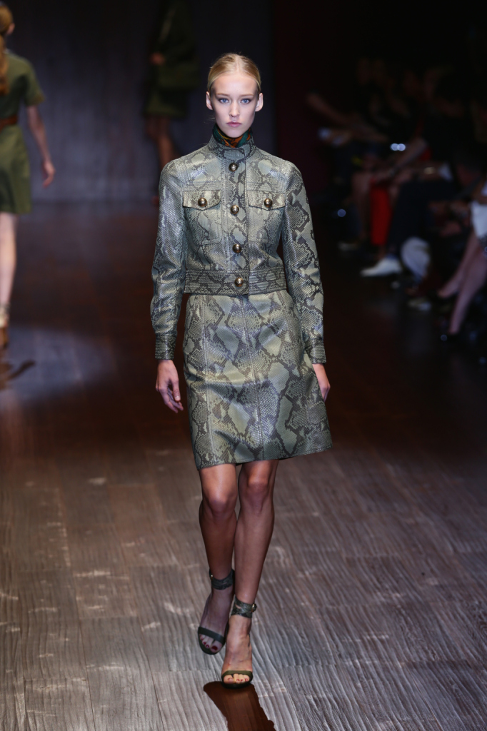 Gucci, MFW, collezione Primavera-Estate 2015: completo con stampa in pitone, gonna più giacca con bottoni dorati