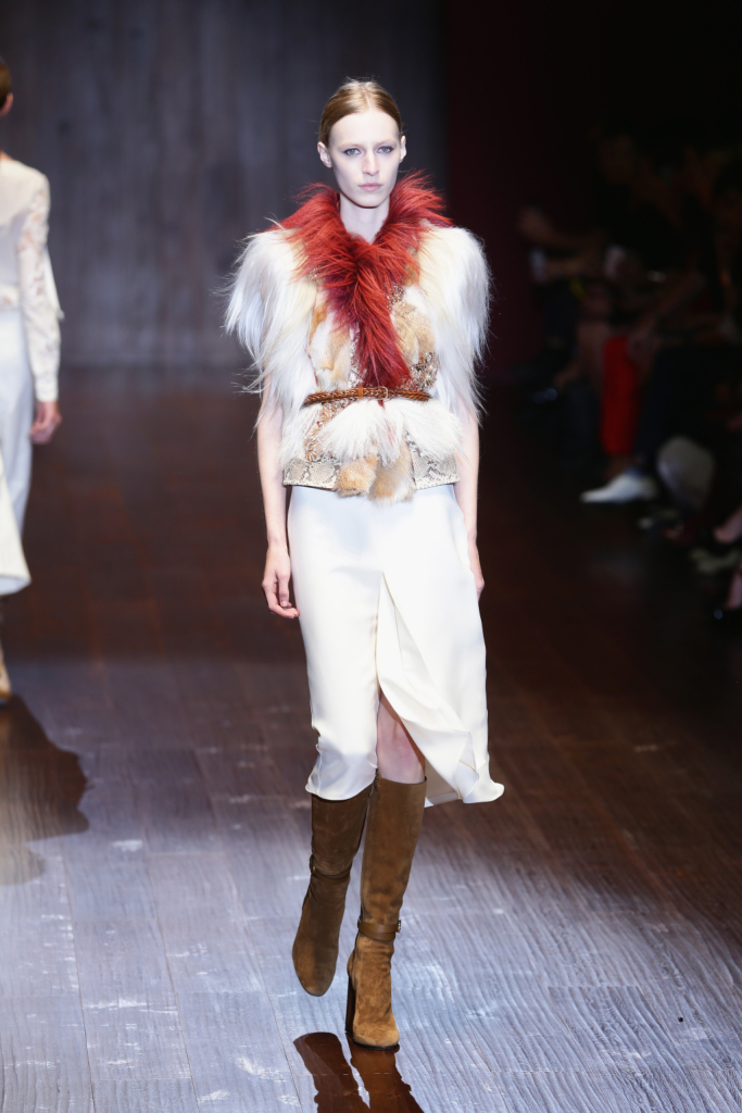 Gucci, MFW, collezione Primavera-Estate 2015: longuette bianca in seta e top con stampa in pitone e inserti in pelliccia e piume, cintura intrecciata alta in vita