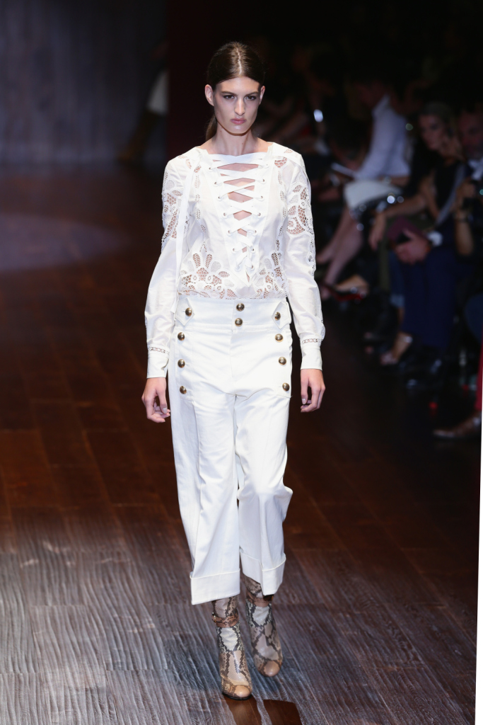Gucci, MFW, collezione Primavera-Estate 2015: pantalone bianco in stile militare con bottoncini dorati e blusa bianca con pizzo macramè e allacciatura francese anteriore