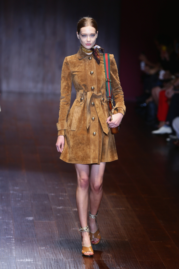 Gucci, MFW, collezione Primavera-Estate 2015: trench marrone in camoscio con bottoncini dorati in stile militare, strizzato in vita da cintura e foulard fantasia al collo. Jackie bag.