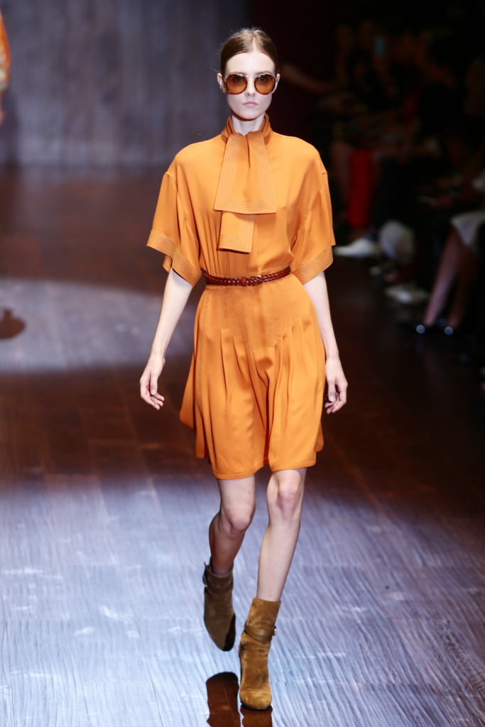 Gucci, MFW, collezione Primavera-Estate 2015: vestito in seta color arancio tangerine con collo a foulard e cintura in vita. Occhiali tondi anni Settanta con lenti tone sur tone