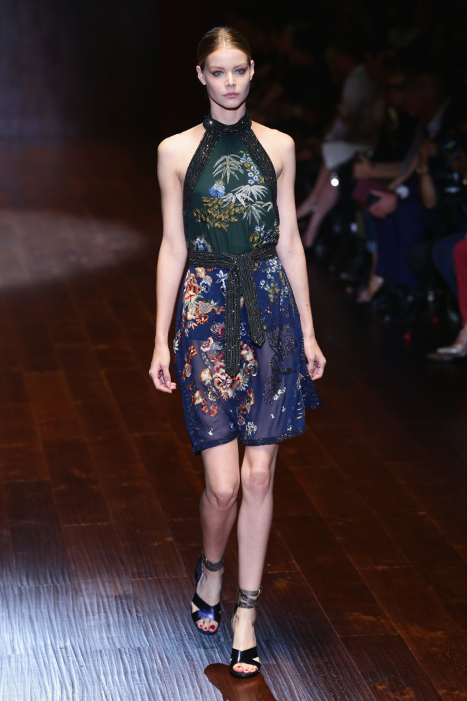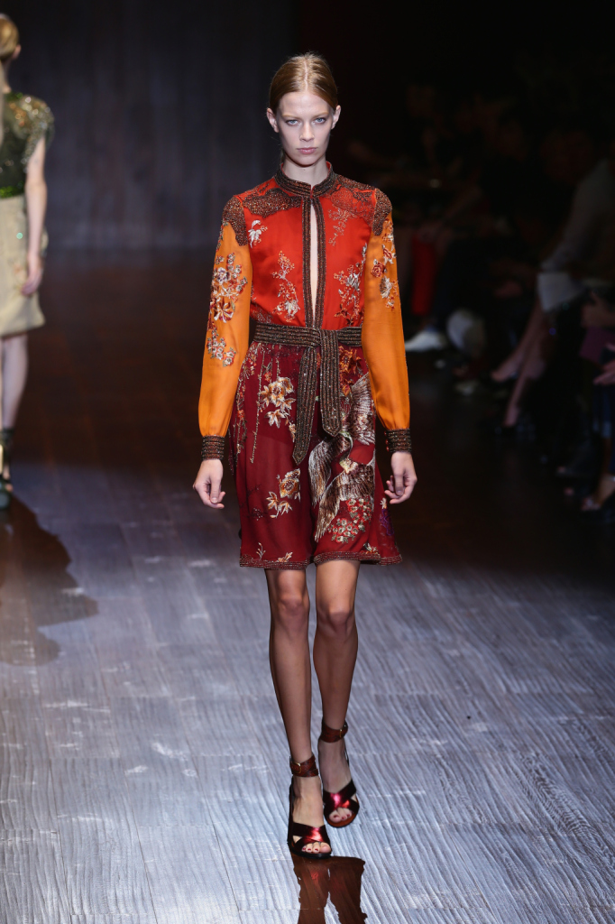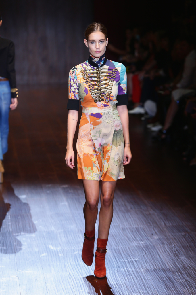 Gucci, MFW, collezione Primavera-Estate 2015: il miniabito è in leggera seta con bordi e adorni di cristalli, la fantasia ricorda l’oriente e il taglio dell’abito quello del kimono
