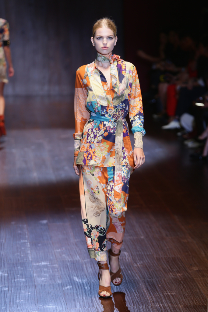 Gucci, MFW, collezione Primavera-Estate 2015: completo kimono in seta a fantasia orientale e fusciacca in vita