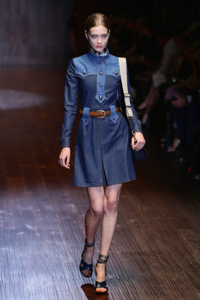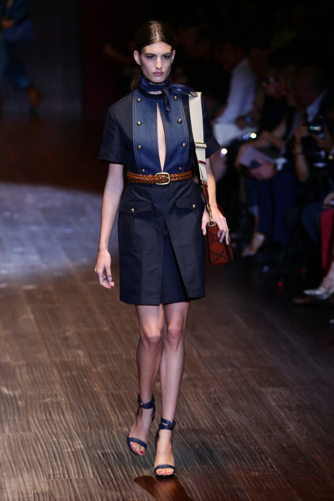 Gucci, MFW, collezione Primavera-Estate 2015: abito in denim stile militare con passanti in contrasto, cintura di cuoio intrecciata in vita