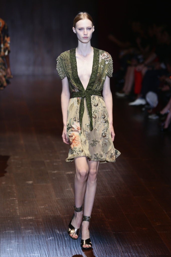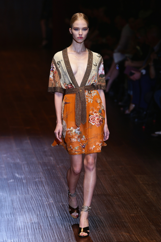 Gucci, MFW, collezione Primavera-Estate 2015: abito floreale in seta, con ampio scollo a kimono sul davanti, cintura e lavorazioni sulle maniche in cristalli e fantasia floreale orientale
