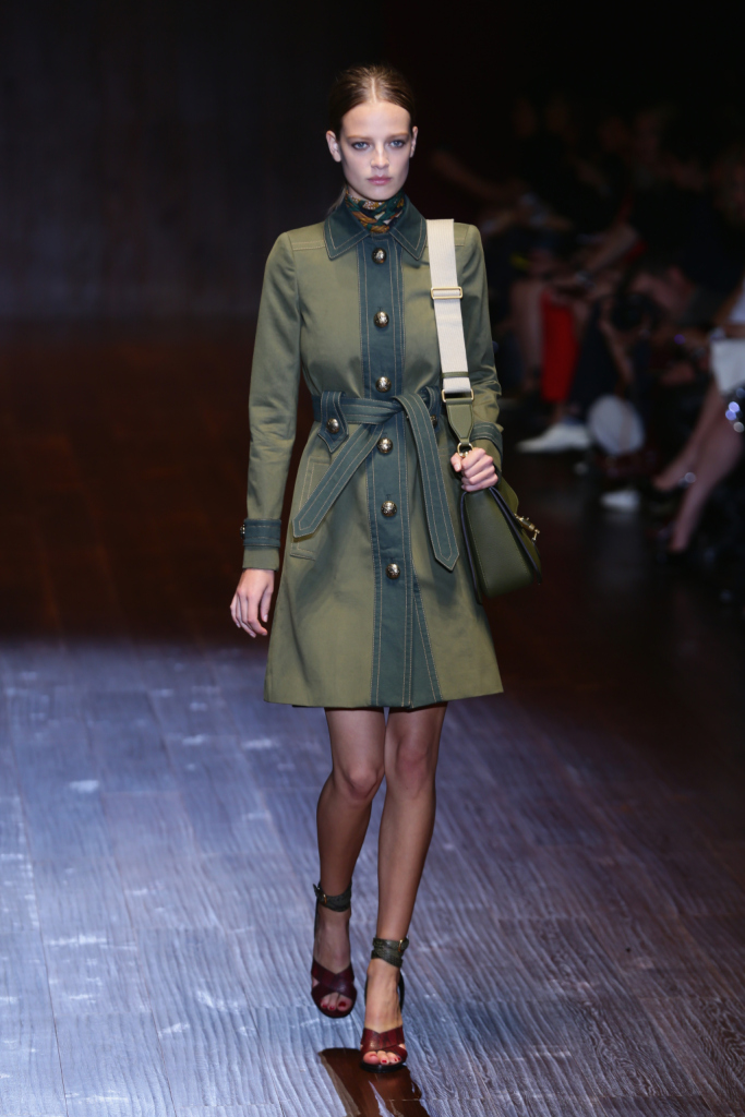 Gucci, MFW, collezione Primavera-Estate 2015: trench in stile militare in due tonalità del verde con bottoncini dorati e cintura in vita