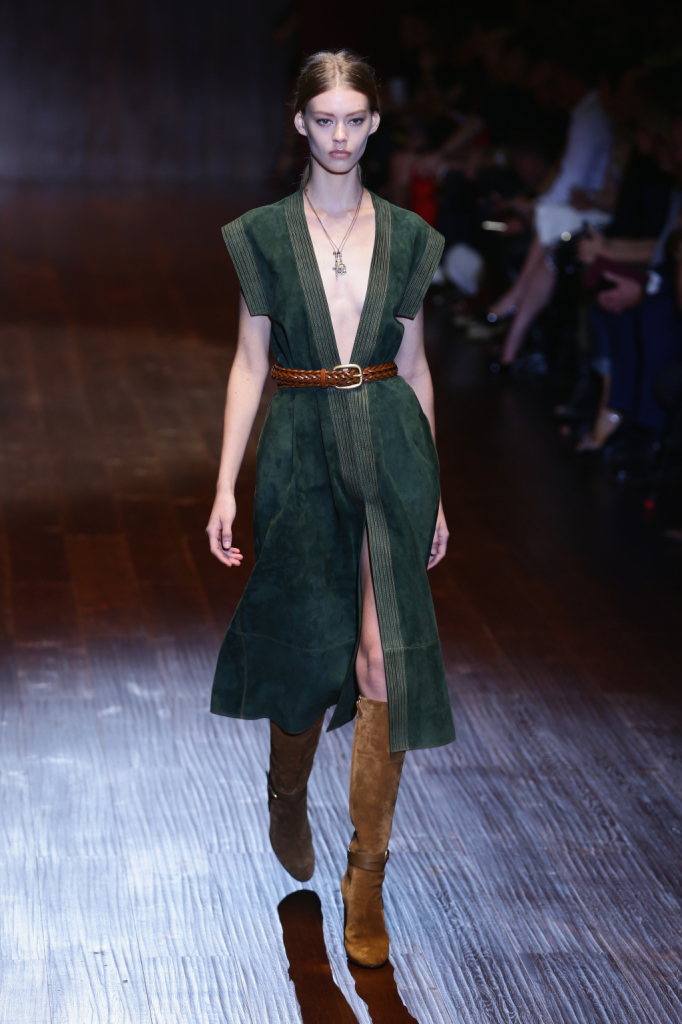 Gucci, MFW, collezione Primavera-Estate 2015: l’abito è in camoscio verde muschio aperto completamente sul davanti e strizzato in vita da una cintura in cuoio. Gli stivali in camoscio arrivano sotto il ginocchio