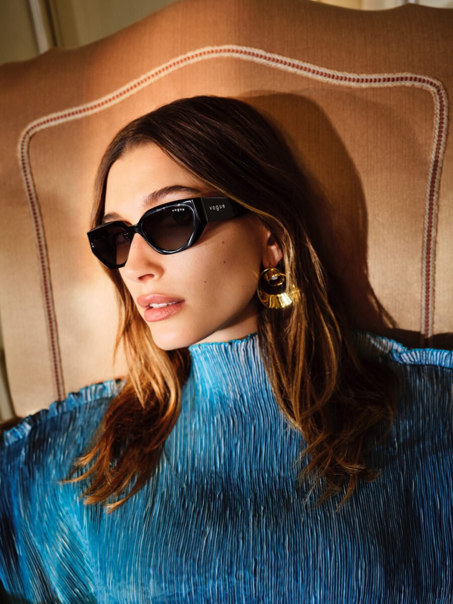 Hailey Bieber in una delle immagini della campagna per la nuova collezione di occhiali Vogue Eyewear