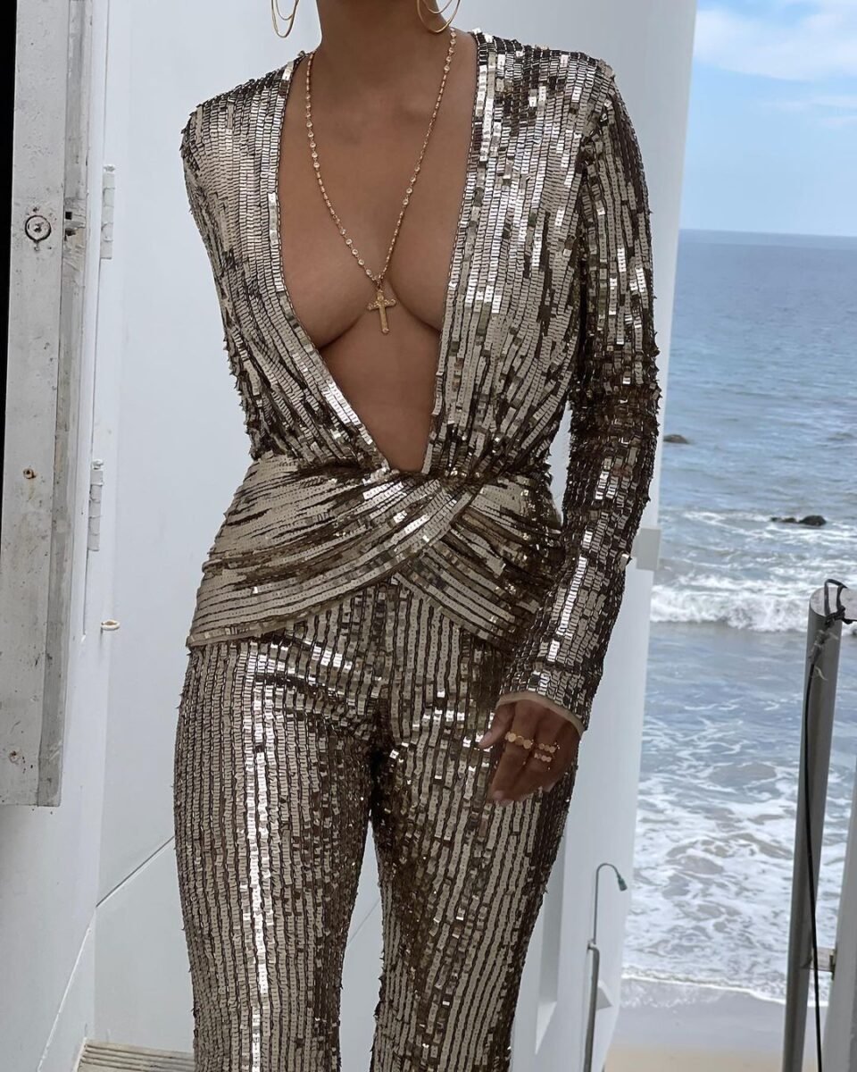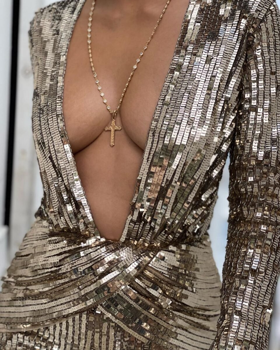 L’abito presenta un’audace scollatura profonda e dettagli che sottolineano la vita. Ha gambe svasate e sarebbe perfetta per una festa glamour in discoteca, anche se l’attrice lo ha reso ancora più moderno e speciale aggiungendo alcuni accessori dorati super audaci.