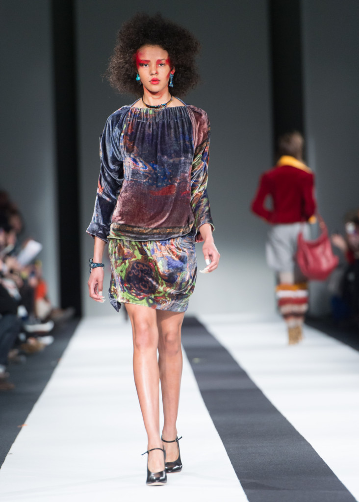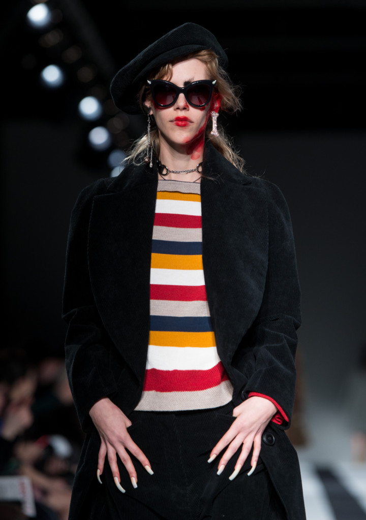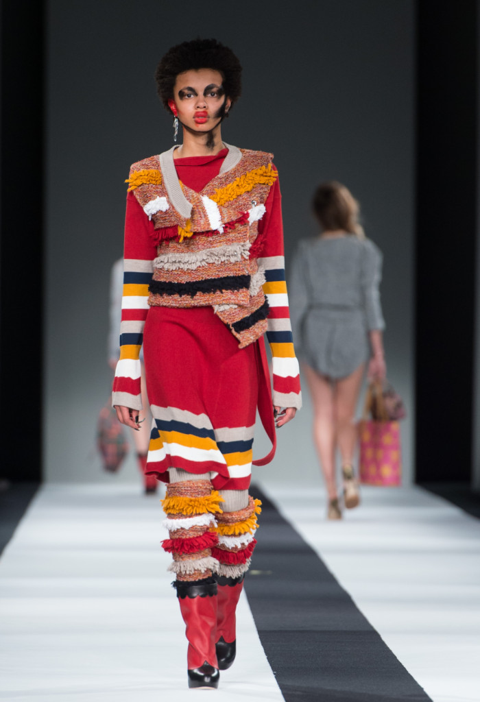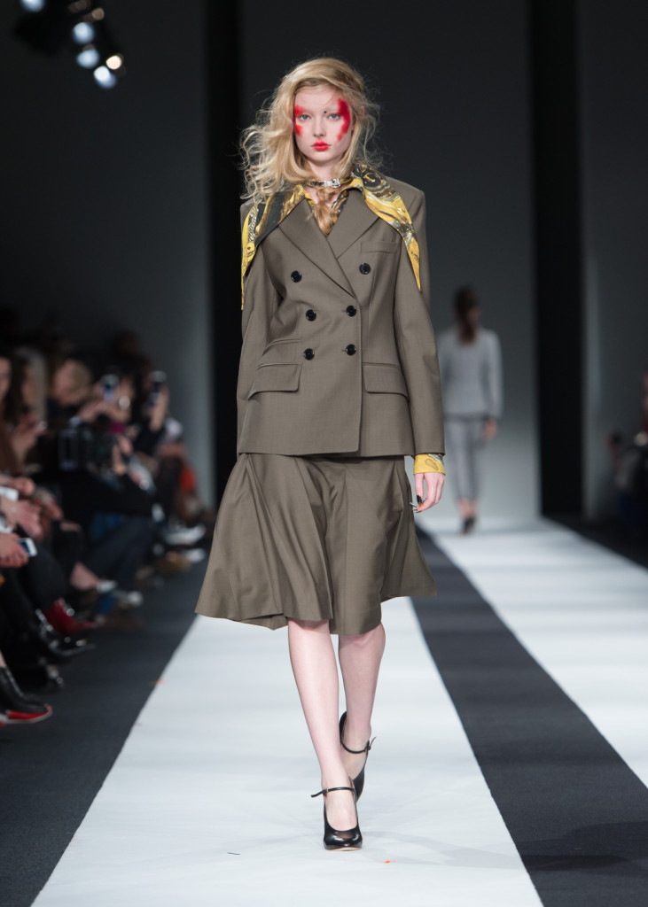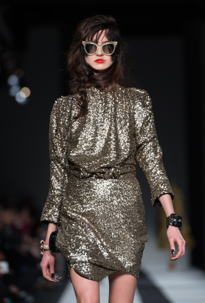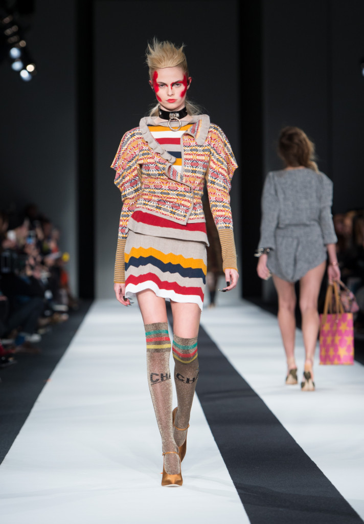 E il gioco è fatto di gonne scozzesi abbinate a maglioni color kaki, di pantaloni di seta i cui colori e fantasie richiamano alla mente Gustav Klimt. Sfilano in passerella t-shirt con scritto “Unite Art Lovers” e cardigan destrutturati, un miniabito di paillettes oro; il gioco continua e giunge al culmine con gli elementi punk di cui Daisy Lowe si fa icona indossando un abito nero di pizzo.