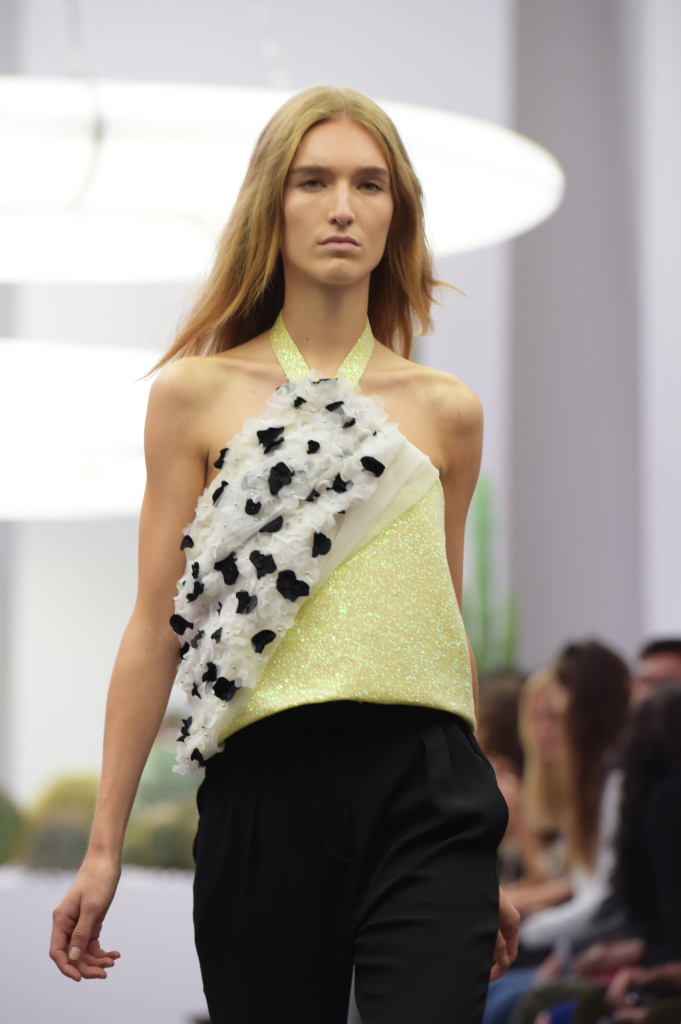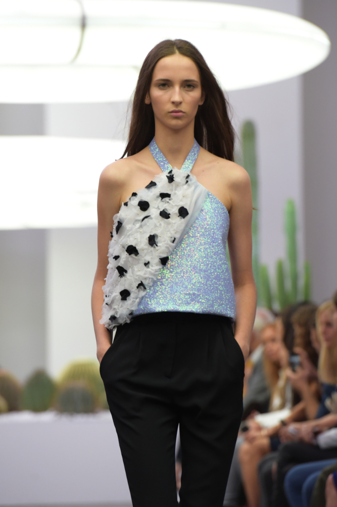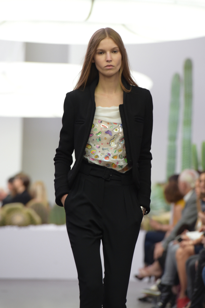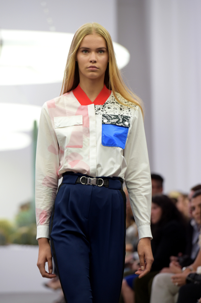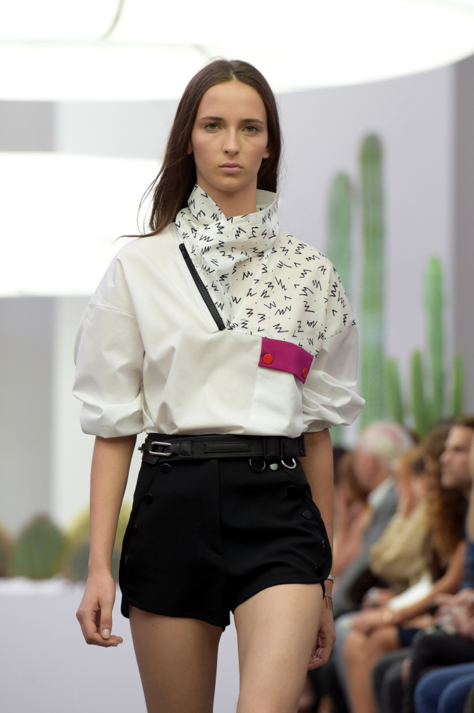 A sfilare, shorts e pantaloni lunghi a vita alta e dalle vistose pinces, camicie con patchwork futuristici e in color block, con fantasia bianconera e colletti e taschini in toni accesi di giallo, arancio, blu, miniabiti votati alle spigolature geometriche, con bottoncini lucidi e cintura in vita, abbinati a tacchi alti e massicci.
