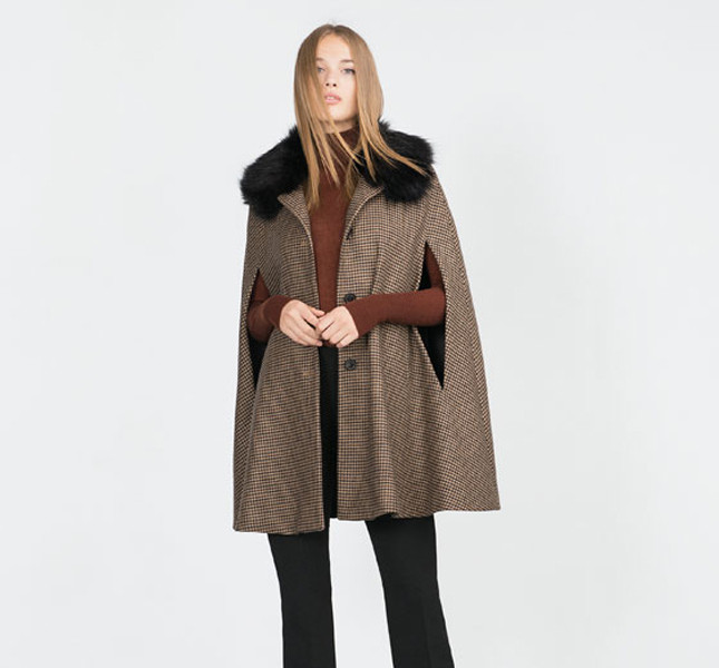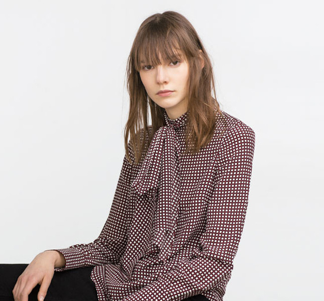Perfetta è la blusa stampata con maxi fiocco al collo firmata Zara, da abbinare a un pantalone nero modello slim, gli stivaletti con tacco bicolore firmati Zara, lo splendido borsalino nero di lana firmato Mango e la bellissima mantellina in pied de poule di Zara: un outfit semplice e dal mood bon-ton.