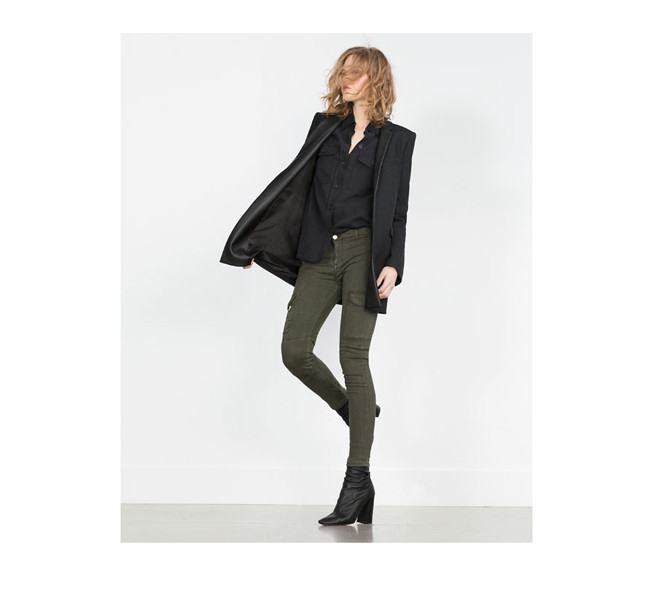 Se ami i pantaloni opta per quelli stretch verde militare firmati Zara e abbinali alla graziosa giacchetta in lana revers di Mango e una camicia nera oppure, per donare un tocco di ironia, scegli il maglioncino H&M ricamato con applicazioni di luminose paillettes e completa il tuo outfit con dei tronchetti di pelle neri con il tacco quadrato e (se devi uscire) una ampia e comoda shopper bag nera firmata Zara: un outfit glam, informale e dal tocco mannish.