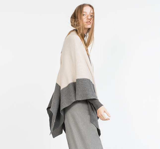 Per una serata romantica, deliziosa è la mantella beige hand made proposta da Zara da indossare insieme a pantoloni slim neri e un morbido cardigan dai colori pastello, il tutto completato con magnifiche décolleté tacco 12.