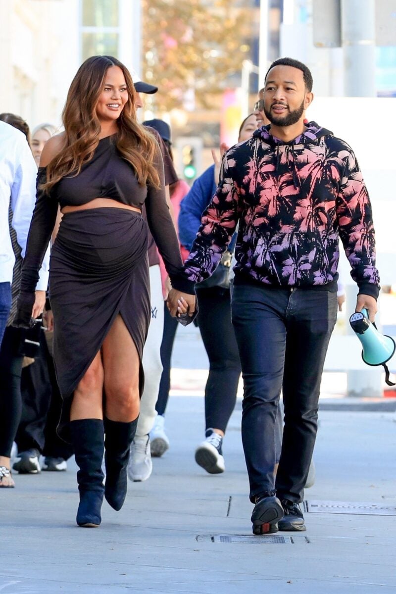 Per questo pomeriggio all’insegna del divertimento, la Teigen ha optato per un outfit comodo e cool, in un caldo color cioccolato, colore perfetto per l’evento. Il crop top di Rick Owens, che sottolineava il ventre, era abbinato a una gonna drappeggiata realizzata nello stesso tessuto. Ai piedi la top calzava degli stivali in camoscio di Isabel Marant dal tacco discreto.