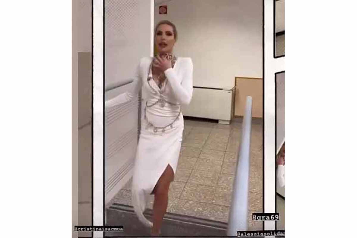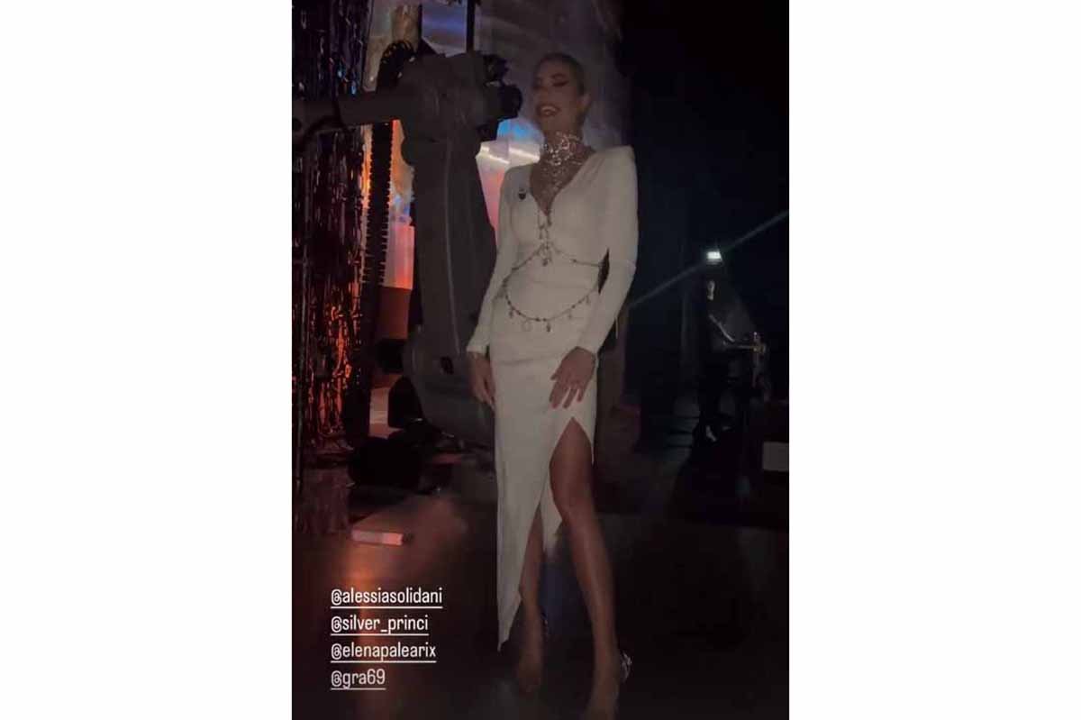 La showgirl si è presentata in trasmissione con un candido vestito lungo bianco, uno dei colori trend della stagione. Un vestito con le maniche lunghe, una scollatura profonda e la gonna a portafoglio dal taglio asimmetrico e con un profondo spacco laterale che metteva in mostra le sue gambe perfette. Lo ha sfoggiato con i capelli legati elegantemente dietro la nuca, a creare un “effetto taglio corto” che metteva in risalto il make-up curatissimo. Ma a colpire tutti gli spettatori è stata la collana-cintura che la fasciava praticamente tutta.