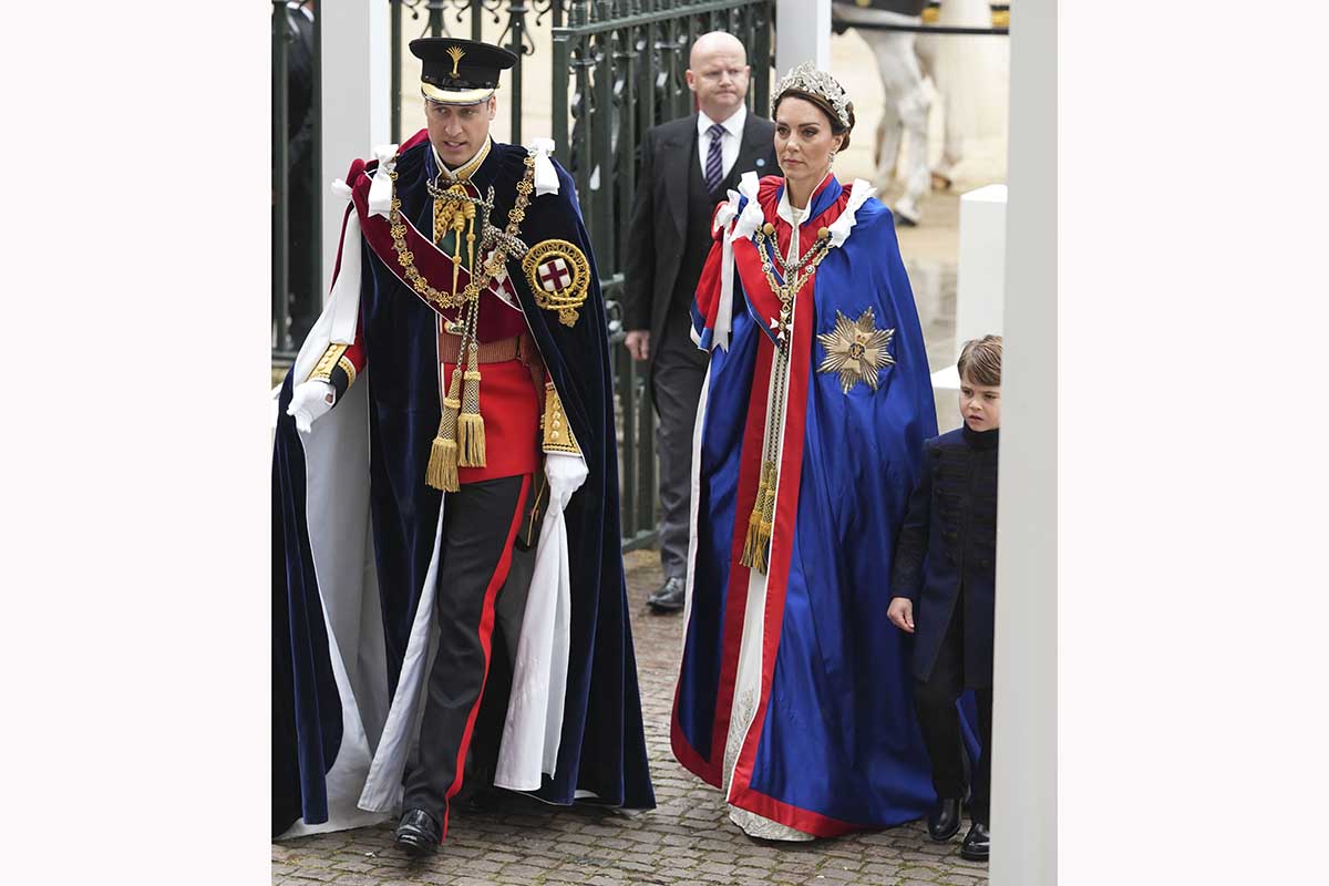 Kate Middleton ha optato per la sua casa di moda preferita, Alexander McQueen. Ha indossato un abito in crêpe di seta avorio con lingotti d’argento e ricami in filo con motivi di rosa, cardo, narciso e trifoglio, gli stessi fiori simbolici visti sull’abito della regina Camilla. Ha accessoriato il look con gli orecchini della principessa Diana e la collana con festone di Giorgio VI della regina Elisabetta. Non ha indossato la tiara, come richiesto da re Carlo III. Al suo posto portava un copricapo di Jess Collett x Alexander McQueen con ricami di foglie tridimensionali.