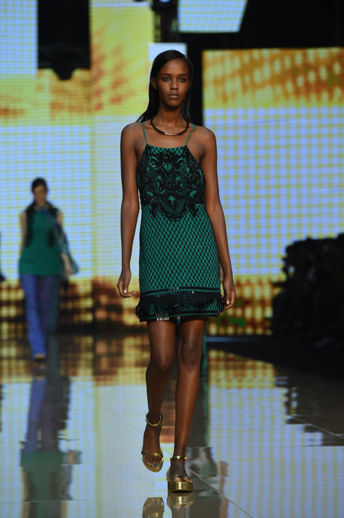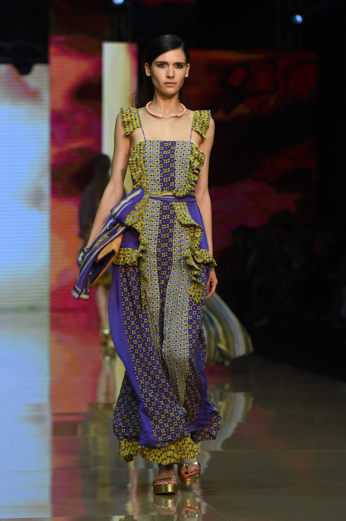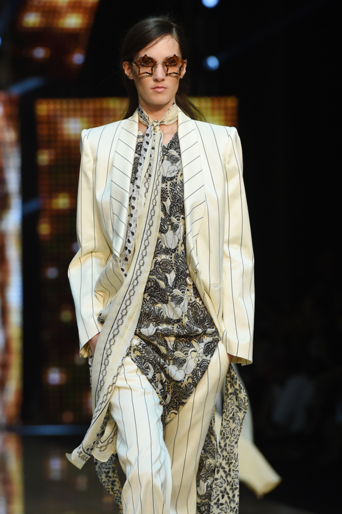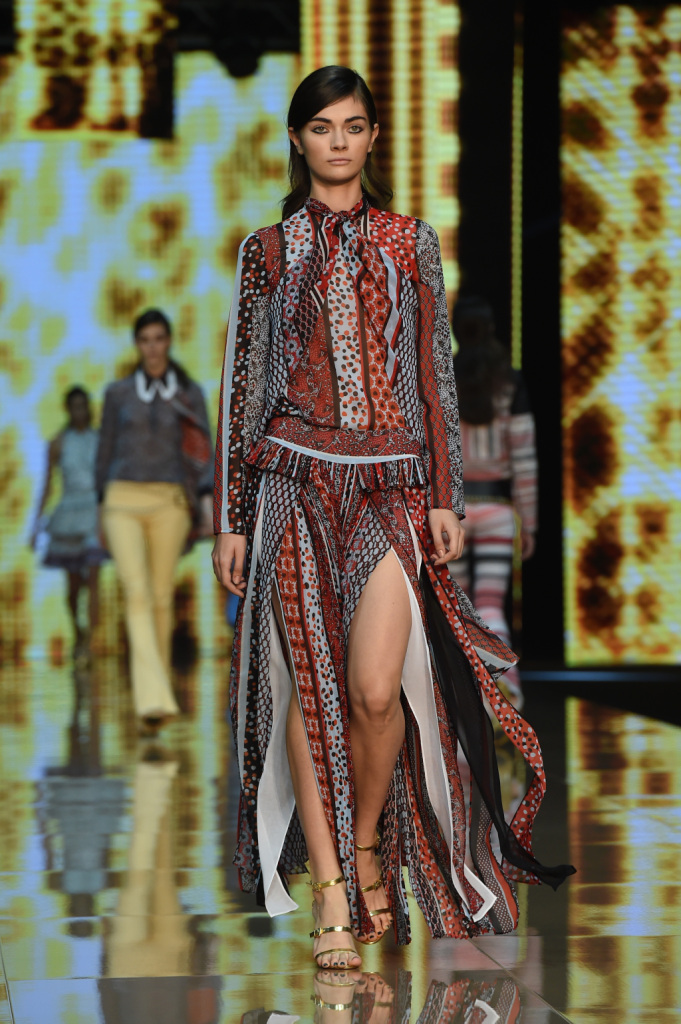 Tra i colori, a dominare sono il giallo e il viola, il verde e il rosso, il blu e l’arancio. Combinati tra loro con un mix di motivi, materiali, lunghezze che risuonano di echi hippie a fianco di altri più spiccatamente country. Se a dominare è un patchwork di rara leggerezza, non mancano le stampe animalier e soprattutto il sequin: la collezione primavera-estate della linea giovane di Cavalli vive tra gli anni Settanta e un ritorno – anzi, una gioiosa celebrazione – delle proprie origini. E si caratterizza per una pluralità e vivacità di outfit dall’animo più o meno romantico, più o meno musicale, più o meno rock – ma in ogni caso freschissimi e solari – tanto che a parità di ispirazione, con i mitici Seventies che sembrano aleggiare più che mai sulle passerelle milanesi, risulta assai più ricca e variegata delle proposte di altri designer, che forse han peccato un po’ di limitate variazioni sul tema.